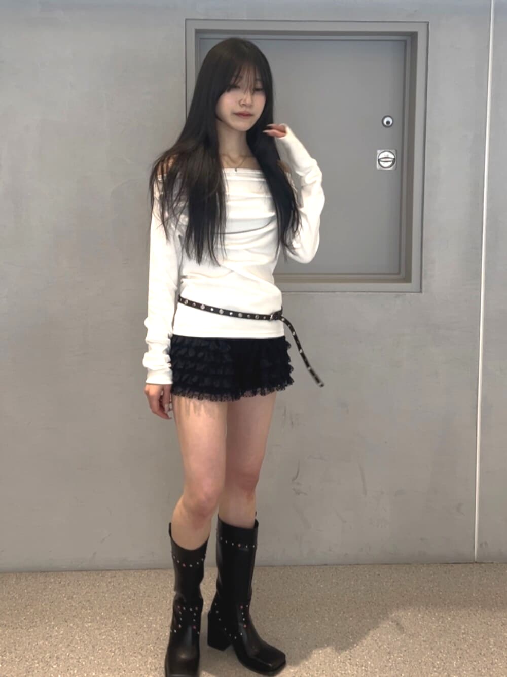 【リール詳細】 トップス トレンドのドレープデザイン! デコルテ周り綺麗に見えるのでウェーブさん大優勝! 生地感しっかりしてるので胸元落ちてこないでストレスフリーに着れます! パンツ レース付きなのでショートパンツでもカジュアルになりすぎずに! 1枚あるとトレンド感◎ ブーツ 24.5でLサイズ着用。 ヒール部分分厚いので歩きやすいです