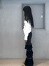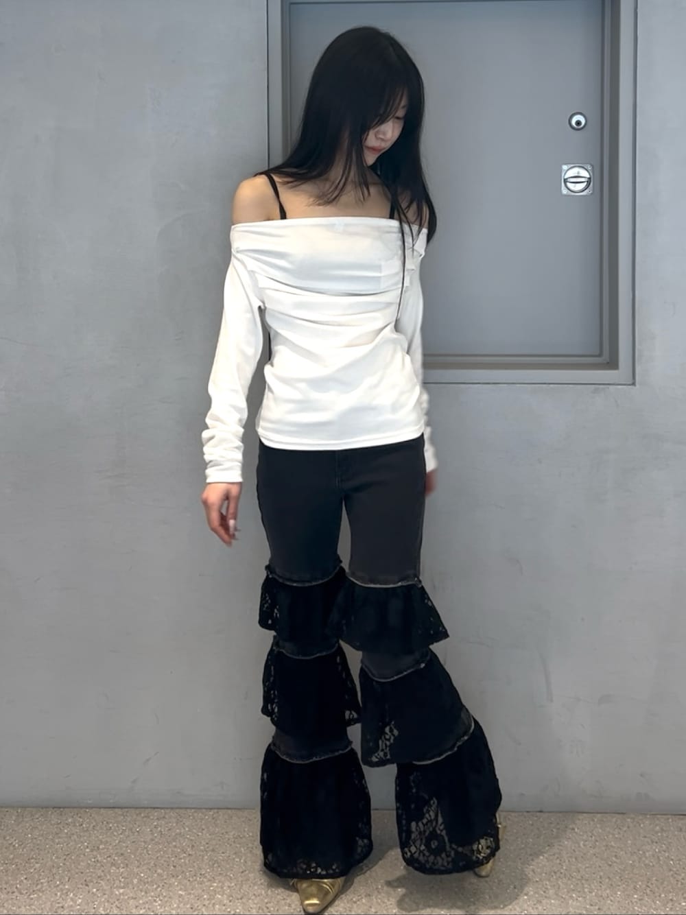 【リール詳細】 トップス トレンドのドレープで胸元盛れます♡ 1枚でキレイめコーデに! 胸元生地感しっかりしてるので落ちてこないで着れてストレスフリーです。 パンツ 163センチでこの丈感です。 フレアデニムだけど柔らかいので履きやすいです。 レースが可愛くて目線行くので足元細見え効果抜群! ミュール 24.5でLサイズ着用。 軽いのであるきやすいです。