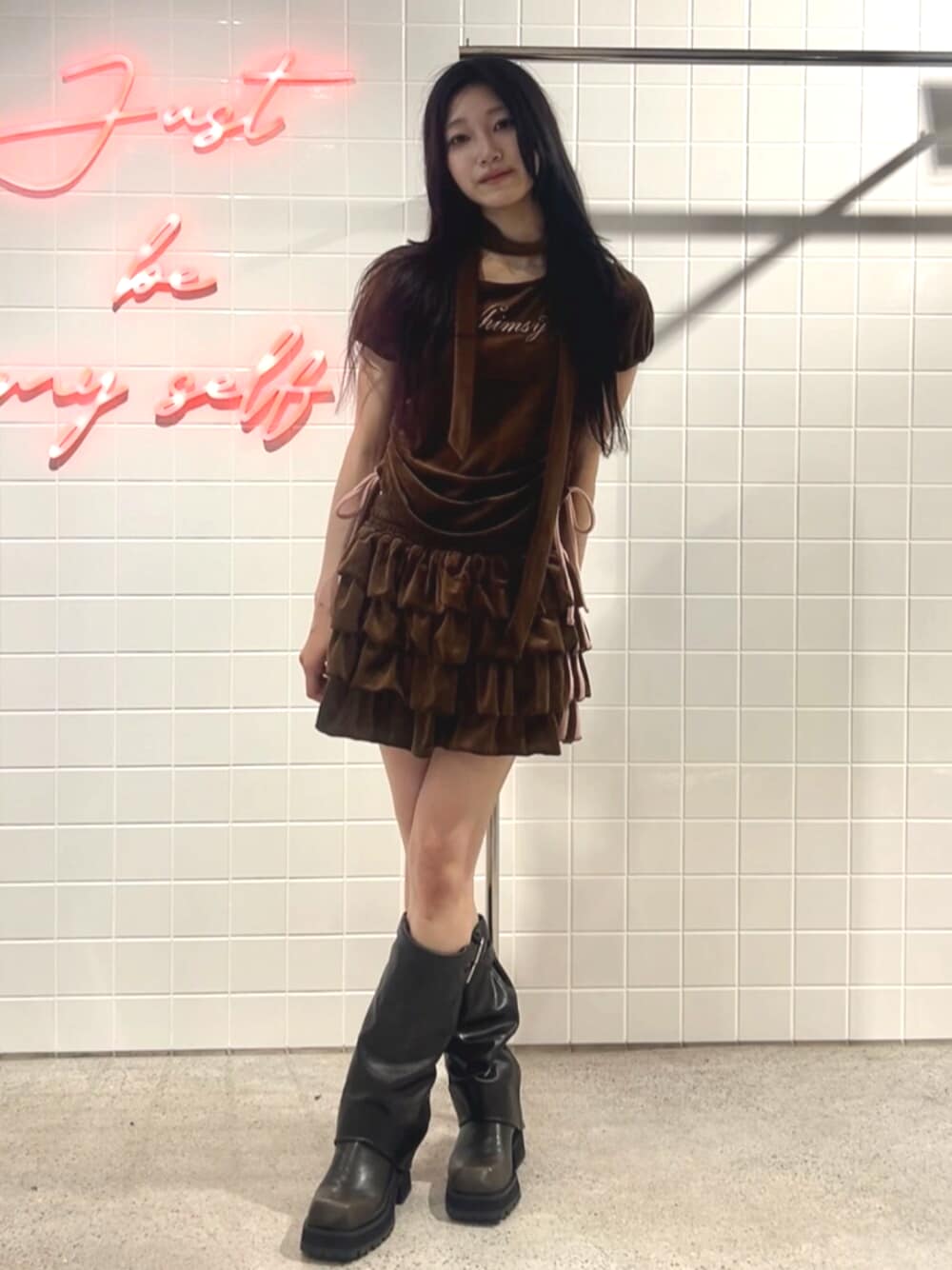トップス ベロア素材で秋コーデにぴったり! デニム合わせだとよりカジュアルコーデに! スカート 中にインパン入ってるので楽ちん! フリルの形が綺麗なので華奢みえ抜群です! ブーツ 24.5でLサイズ着用。 軽いので歩きやすいです!