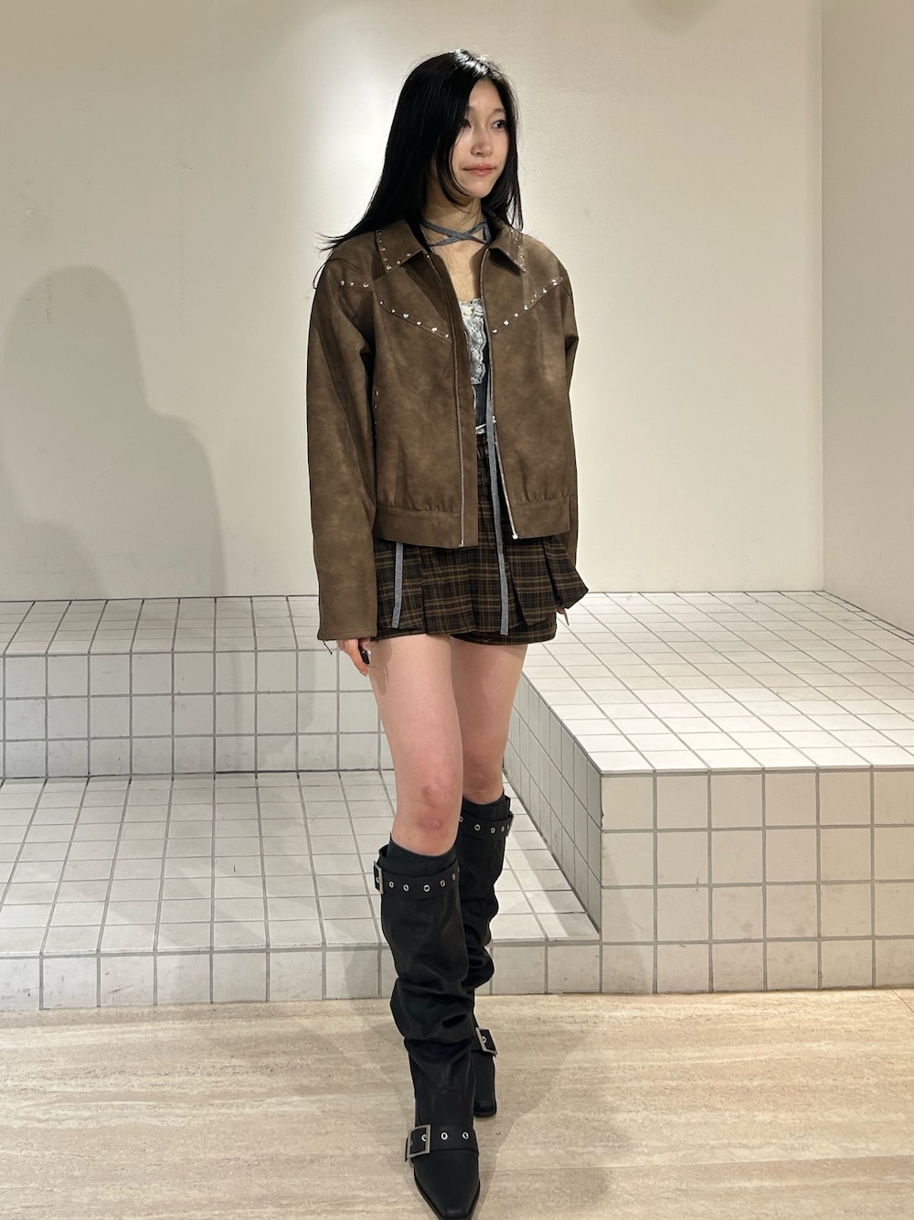 ジャケット 短丈すぎず、腰くらいの長さなのでどんなトップスとも相性◎ スタッズが甘辛コーデにぴったりです! タイト目じゃないので大きめのインナー着も着膨れせずに着れます! トップス 一枚で可愛いチョーカー付き! 首元開くので華奢に見えます♡ インナーにももちろん、春一枚で着ても可愛いので万能です。 スカート トレンドのショートパンツ形! 生地感もしっかりしてるので高見え抜群です。 ブーツ 24.5でエルサイズ着用。 軽いので歩きやすいです!