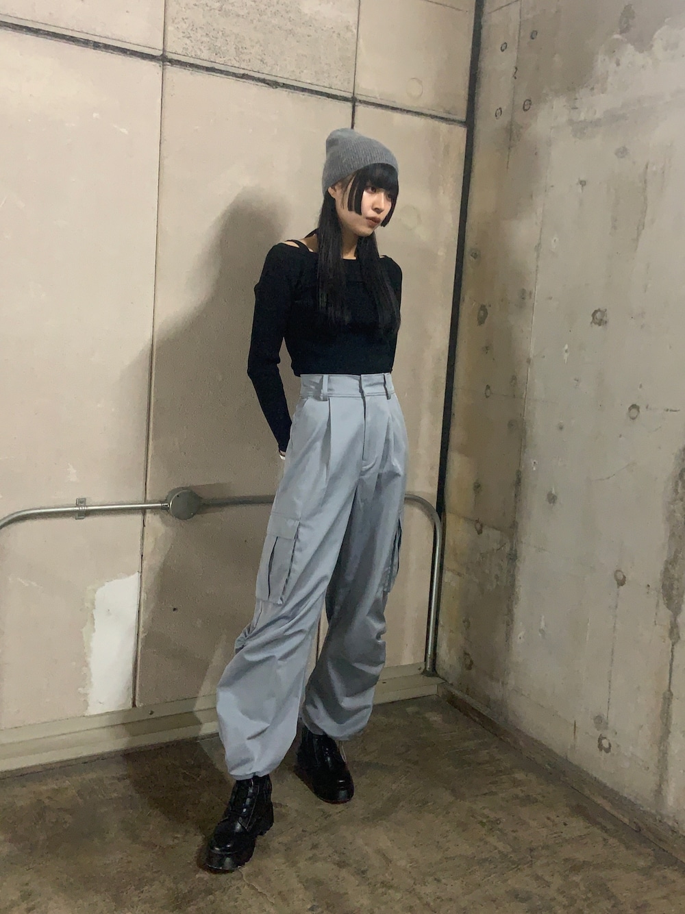 【ニット】MURUAらしいデザインニット!地味になりがちな薄手のニットが一気に主役ニットに! 【パンツ】横のくしゅくしゅが可愛いカーゴパンツ!腰回りはスッキリな綺麗なシルエットになってます!