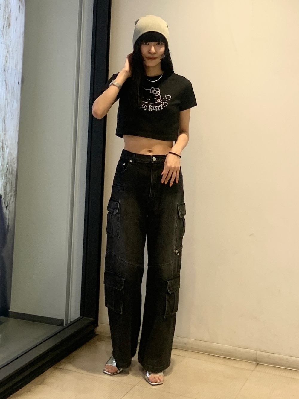 【Tシャツ】キティちゃんのコラボTです!今年大人気のクロップド丈でトレンド感満載のサイズ感になってます。 カーゴデニムとシルバーミュール、今季の人気詰め込んだコーデです!
