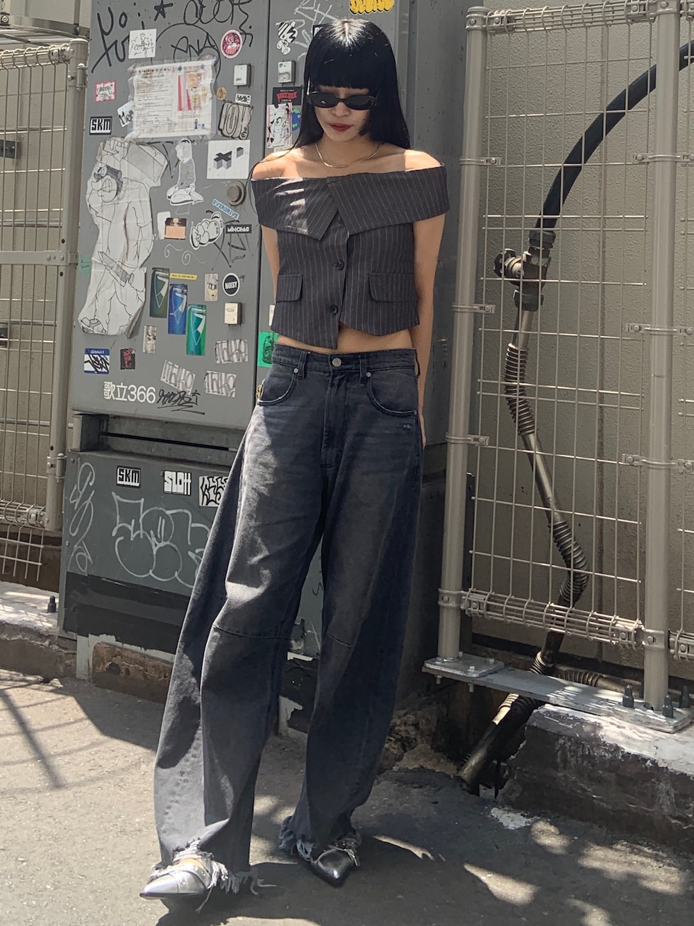 【トップス】オフショルでも可愛らしすぎずに使って頂けるデザインになってます! 綺麗めスカートでもカジュアルデニムでも◯ 【デニム】トレンドのコクーンデニム。程よくダメージが入っておりルーズに使えます! 【シューズ】今流行りのつま先とんがってるミュールですが、フラットなので歩きやすくなってます!