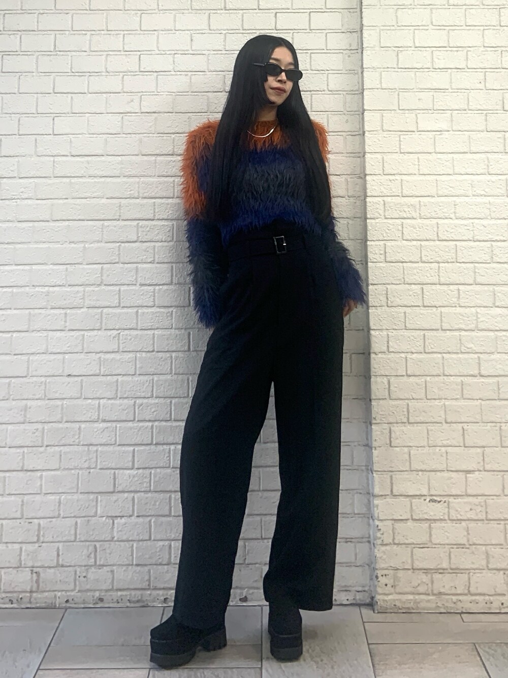 【ニット】171cmFサイズ。丈短め袖長めです!肌が弱い私でも素肌の上から1日中着ていてもチクチク感全くありません! シャギーニットですが、コンパクトな作りで毛も立ちすぎないのでボリューム気になる方には特におすすめです。 【パンツ】171cmMサイズ。名前の通りスーパーハイウエストです。ベルト付きでウエストも綺麗に見えるのでメリハリのあるシルエット作れます。 【ブーツ】普段24.5〜25.0cmの24.5cm着用です。10cmの厚底とは思えない軽さと履き心地で、スウェードの柔らかい素材なので足首も痛くなることがありません。騙されたと思って履いて欲しい一足!