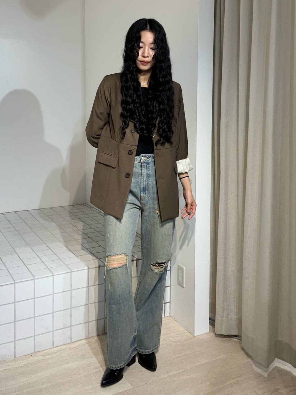 【ジャケット】171cmFサイズ。裾がはずせてショート丈にもなる2wayタイプ。裏地も可愛いので捲るのがおすすめ。 【デニム】171cmMサイズ。十分な丈あります。硬くないデニムで履きやすく足が長く見えます! 【ブーツ】普段24.5~25.0cmの24.5cm着用。ジャストです!フラットで疲れにくくなってます。