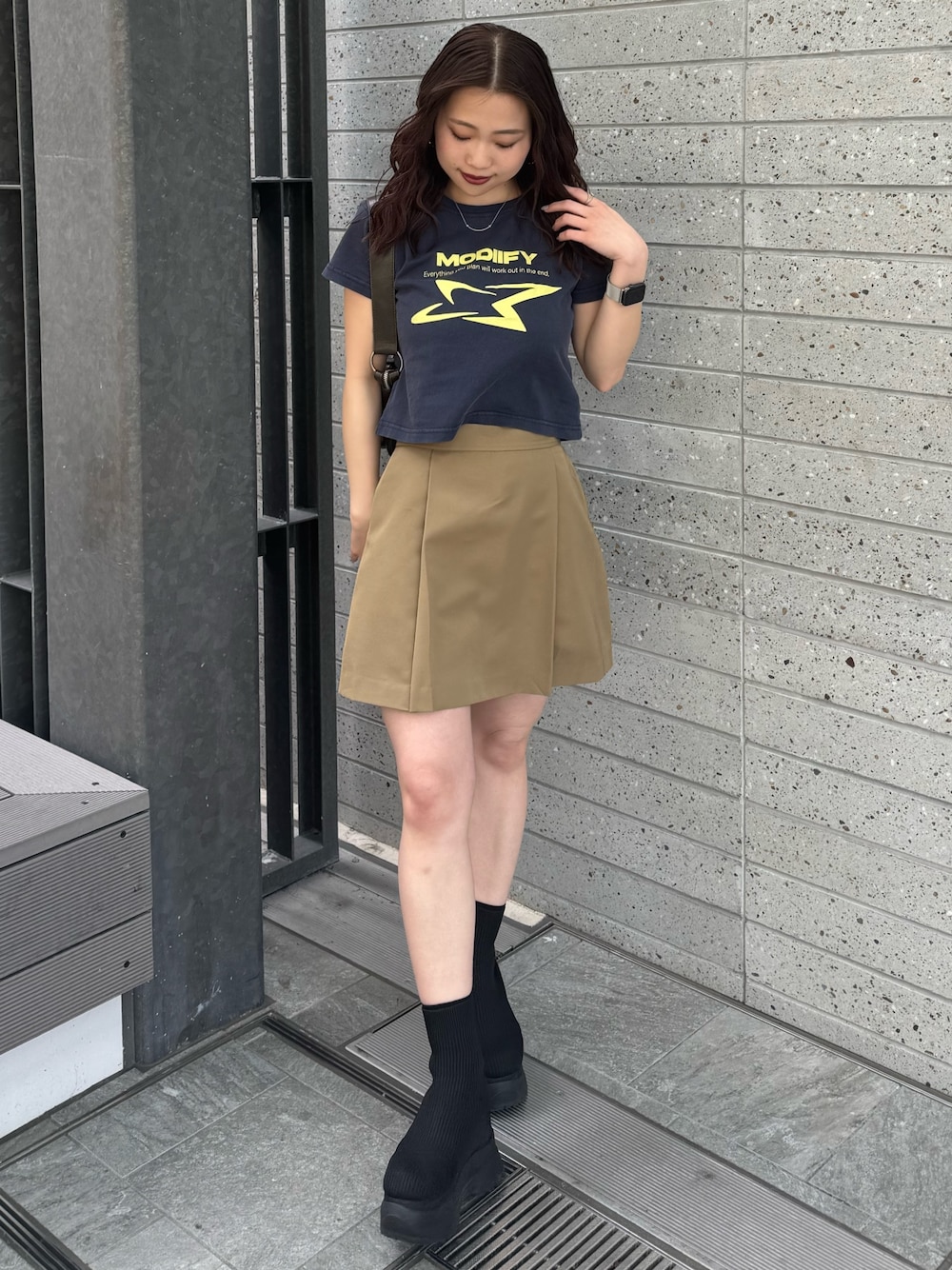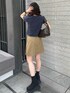 【tops】 153cm/Fサイズ着用しており、おへそ周りまで隠れてくれる丈感です。タイトめなシルエットですが伸縮性あり◎ 【skirt】 153cm/Sサイズ着用しており、ミニ丈ですがインナーにパンツが付いているので安心して着用して頂けます◎サイドに付いているファスナーをあけることでスリット作る事も可能です。 【shoes】 普段の22.5cm着用で、横幅広めな私でもピッタリでした!傾斜がなくクッション性があり安定感のある厚底なので普段使いしやすくおすすめです◎