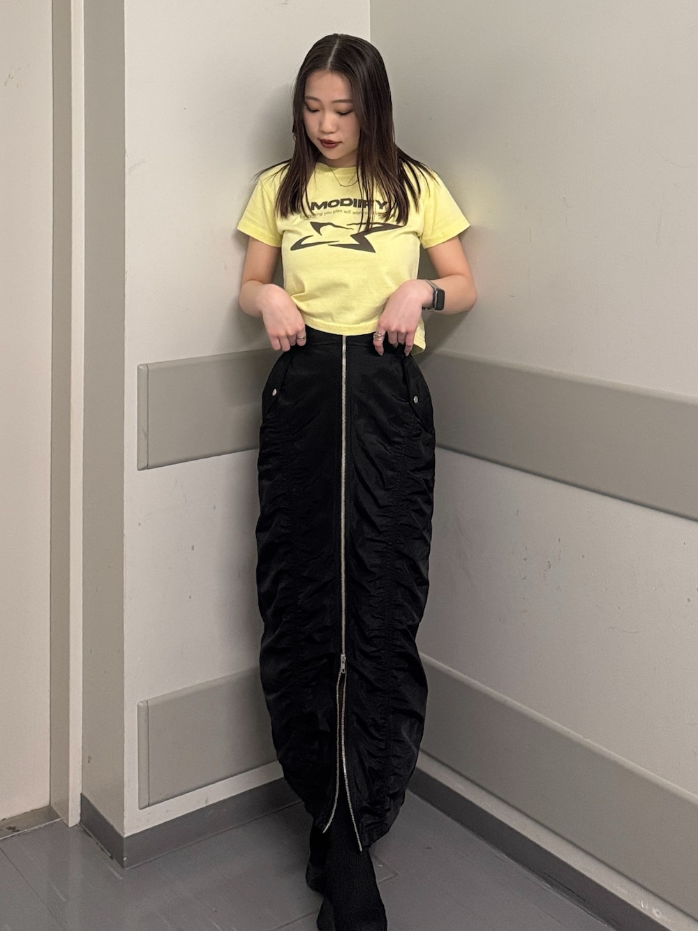 【tops】 153cm/Fサイズ着用しており、おへそ周り少しつかるくらいの丈感です。ピタッとタイトめすぎずなので着心地◎ 【skirt】 153cm/Sサイズ着用しており、ハイウエストでタイトめなシルエットですがダブルジップなのでスリットを作る事でシルエットカバーしてくれるので細見え間違いなしです! 【shoes】 普段の22.5cm着用しており、横幅が広めな私でもぴったりでした!長めの靴下とレイヤードするのもおすすめです!