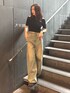 【tops】 153cm/Fサイズ着用しており、おへそ周りより少し上の丈感です。肩のオフショルデザインもさりげなくスッキリ見えします! 【pants】 153cm/Sサイズ着用しており、トレンドのコクーンシルエットで骨盤まわりが気になる私でもシルエットカバーしてくれます! 丈感は少しゆったりしていて長めなので厚底ブーツ合わせがオススメです! 【shoes】 普段の22.5cm着用で、横幅広めな私でもぴったりでした!足首もぴったりフィットしてくれるのでかなりスッキリ見えします!