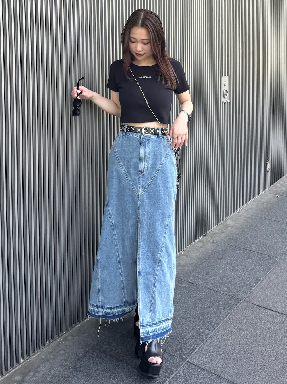 【tops】 153cm/Fサイズ着用しており、おへそ周りより上の丈感です。タイトめなシルエットですが伸縮性あり◎ 【skirt】 153cm/Sサイズ着用しており、丈感は足首につかるくらいまであるので厚底サンダルなどの合わせがおすすめです!骨盤まわりのシルエットもカバーしてくれます! 【shoes】 普段の22.5cm着用で、横幅広めな私でもピッタリでした!前も高さあるので傾斜なく安定感がありとても軽く履きやすいです!