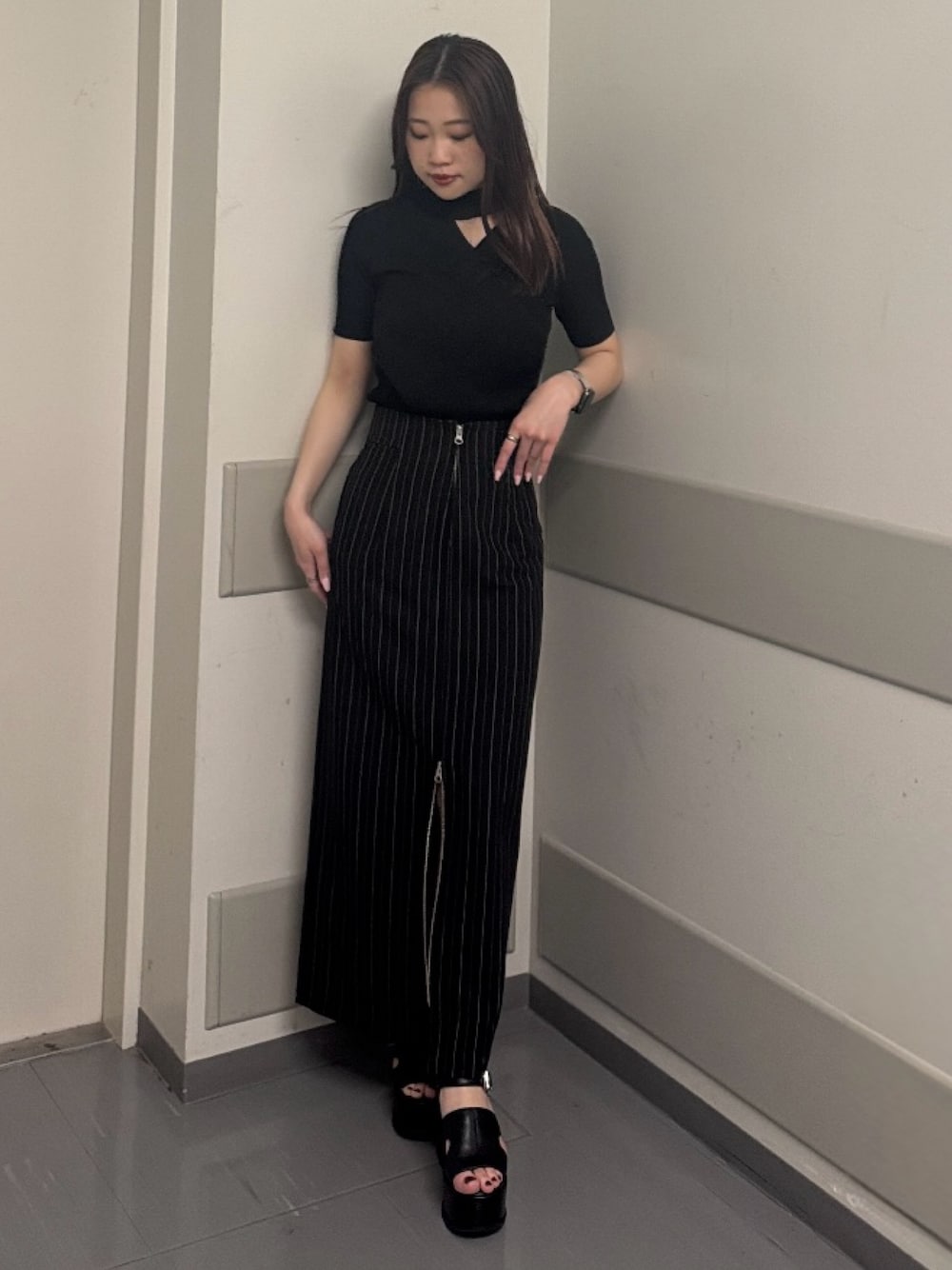 【tops】 153cm/Fサイズ着用しており、タイトめなシルエットですが伸縮性あり◎ おへそ周りまで隠れてくれる丈感でチョーカーデザインが顔まわりスッキリ見えします! 【skirt】 153cm/Sサイズ着用しており、低身長さんでも丈感スッキリ着用いただけます!ハイウエストなのでスタイルアップ間違いなしです◎ 【shoes】 普段の22.5cm着用で、横幅広めな私でもピッタリでした!前も高さあるので傾斜なく安定感がありとても軽く履きやすいです!