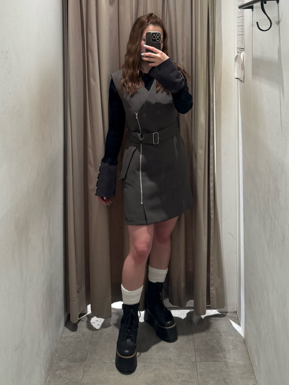 【onepiece】 153cm/Fサイズ着用しており、ウエストマーク高めの位置なので脚長効果まちがいなし◎ 2wayなのでジレとしても着用可能です! 【inner】 153cm/Fサイズ着用しており、タイトめなシルエットですが伸縮性あり◎ 【shoes】 普段の22.5cm着用で、横幅広めな私でもピッタリでした!前も高さあるので傾斜なく安定感がありとても軽く履きやすいです!