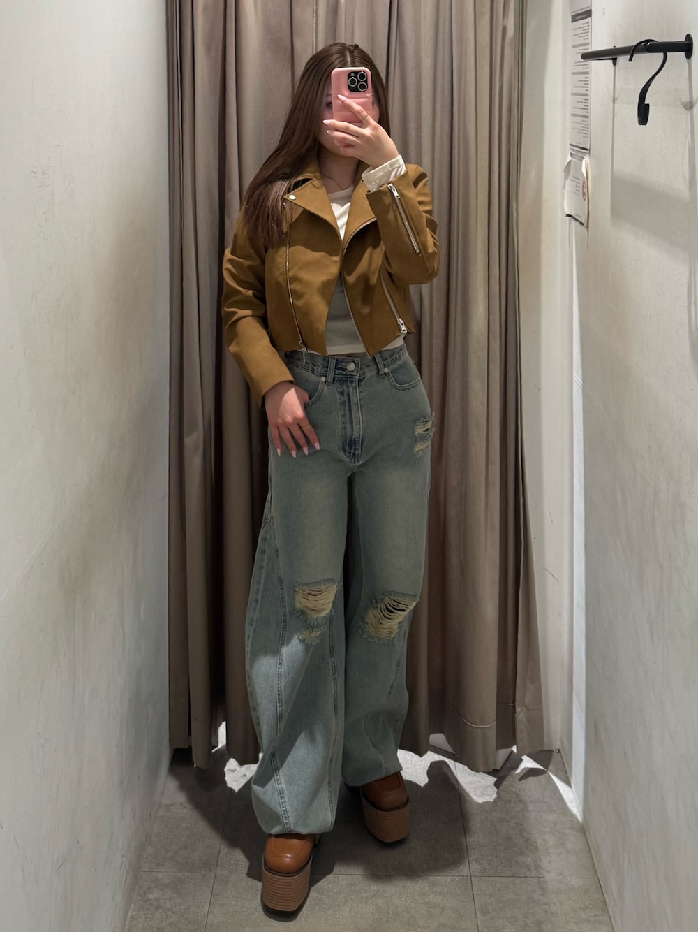 【jacket】 153cm/Fサイズ着用しており、フェイクレザーですごく柔らかく軽いので着用しやすいです♡ ショートなのでスタイルUP間違いなし◎ 【tops】 153cm/Fサイズ着用しており、シアー素材で春にぴったり♡鎖骨まわりスッキリ見えしてくれます!ジャケット織りスタイルも◎ 【denim】 153cm/Sサイズ着用しており、流行りのコクーンシルエットでダボッとしすぎずスタイルアップ効果〇低身長さんは厚底合わせがおすすめです! 【shoes】 普段の22.5cm着用で、横幅広めな私でもピッタリでした!前も高さあるので傾斜なく安定感がありとても軽く履きやすいです!