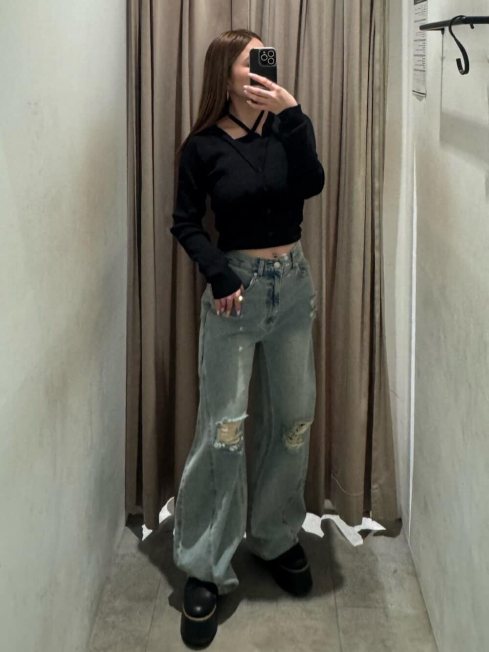 【tops】 153cm/Fサイズ着用しており、タイトめなシルエットですが伸縮性あり〇アクセ無しでも、しまってくれるのでおすすめです♡ 【denim】 153cm/Sサイズ着用しており、流行りのコクーンシルエットでダボッとしすぎずスタイルアップ効果〇低身長さんは厚底合わせがおすすめです! 【shoes】 普段の22.5cm着用で、横幅広めな私でもピッタリでした!前も高さあるので傾斜なく安定感がありとても軽く履きやすいです!
