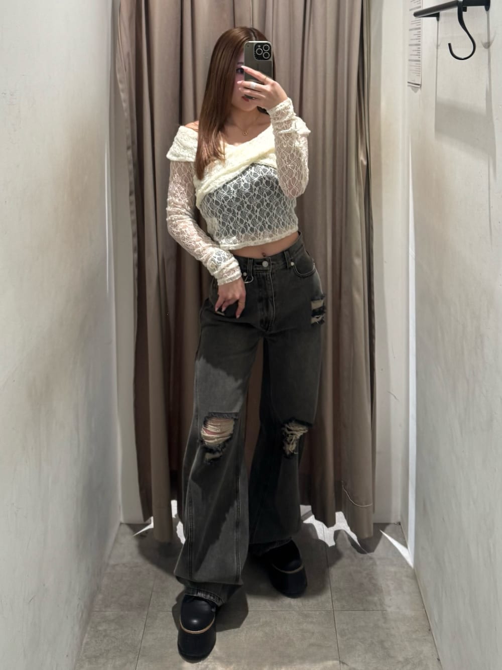【tops】 153cm/Fサイズ着用しており、タイトめなシルエットでオフショルデザインが鎖骨まわりもスッキリみえしてくれます! 【denim】 153cm/Sサイズ着用しており、流行りのコクーンシルエットでダボッとしすぎずスタイルアップ効果〇低身長さんは厚底合わせがおすすめです! 【shoes】 普段の22.5cm着用で、横幅広めな私でもピッタリでした!前も高さあるので傾斜なく安定感がありとても軽く履きやすいです!