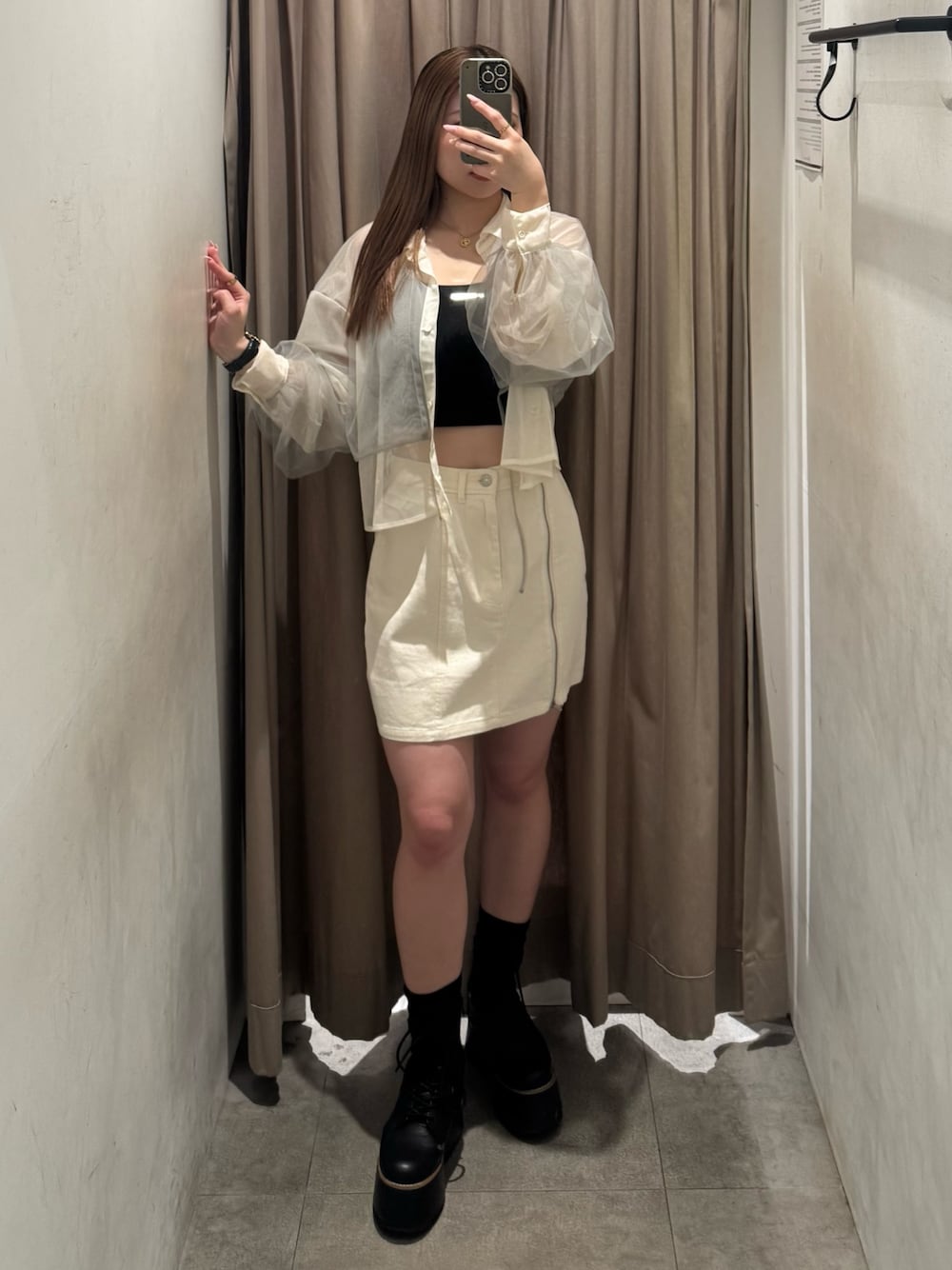 【shirt】 153cm/Fサイズ着用しており、ショート丈なので低身長さんでもスッキリみえします!透ける素材なのでインナーには見えてもいいキャミソールがおすすめです♡ 【skirt】 153cm/Sサイズ着用しており、ハイウエストなので低身長さんでもスタイルアップ間違いなし◎素材も柔らかくて着用しやすいです! 【shoes】 普段の22.5cm着用で、横幅広めな私でもピッタリでした!前も高さあるので傾斜なく安定感がありとても軽く履きやすいです!