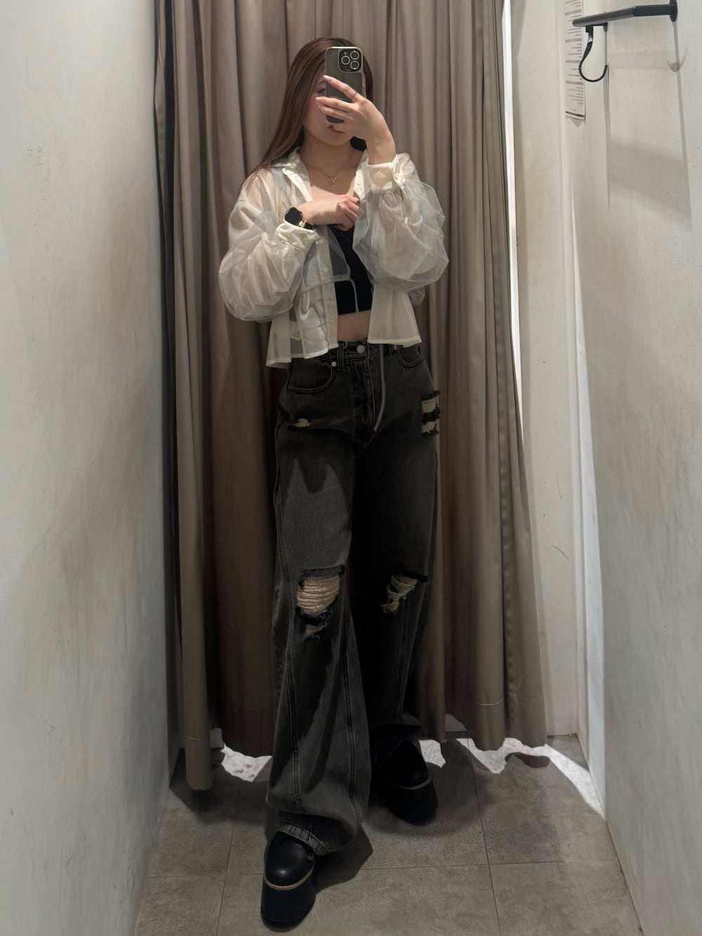 【shirt】 153cm/Fサイズ着用しており、ショート丈なので低身長さんでもスッキリみえします!透ける素材なのでインナーには見えてもいいキャミソールがおすすめです♡ 【denim】 153cm/Sサイズ着用しており、流行りのコクーンシルエットでダボッとしすぎずスタイルアップ効果〇低身長さんは厚底合わせがおすすめです! 【shoes】 普段の22.5cm着用で、横幅広めな私でもピッタリでした!前も高さあるので傾斜なく安定感がありとても軽く履きやすいです!