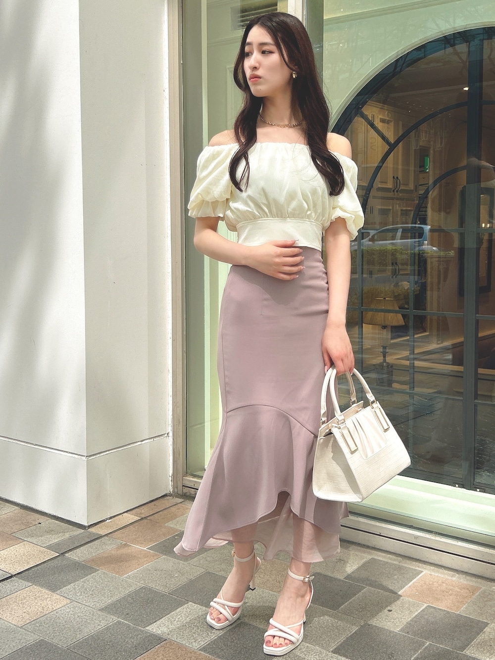 おしゃれなカフェでのランチコーデ ☕️ 【ダブルスリーブボリュームブラウス】 オフショルでもノーマルでも2WAYで使える優秀TOPS ♡ 二の腕もカバーしてくれるのでとても華奢見えします! 【シアードッキングマーメイドスカート】 ラインが綺麗に見えて足元に抜け感のあるスカートです!どんなトップスとも相性抜群なので着回し沢山出来ます ♡ 【ランダムラインサンダル】 24.5cmでLサイズ着用してます!普段のサイズでピッタリです ♡ ストラップ付きなのでピンヒールでも安定感があります! 🌷︎リアルバイアイテム🌷︎ 【クロコライクスクエアバッグ】 500mlのペットボトルも入っちゃう大容量バッグ!ショルダー付きなので肩掛けもできますよ ♡