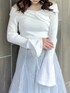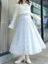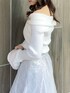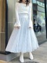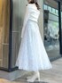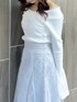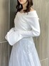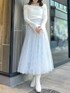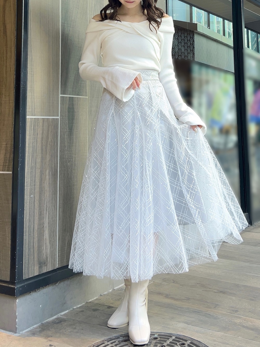 【トップス】 オフショルと2WAYで着れる色っぽさと甘さのバランスが絶妙なニットトップス。オフショルで着てもピタッと肌にフィットしてくれるため、ずり落ちてくる心配もありません。首元の開きがデコルテを美しく、フレアスリーブで腕をスラっと見せてくれます◎胸元のクロスデザインは立体感を出してくれ、華奢見え間違いなしです✨ 【スカート】 店頭でも大人気の高級感と華やかさのあるスカート💠今季トレンドのスパンコールでチェック柄が作られており、特別感のある1枚です❄️照明の下でも綺麗ですが、自然光に当たるとまるで水面に反射する光のようにキラキラと光ります💭🫧チュール素材でとっても軽く、動くたびにふわっと揺れて躍動感を演出してくれます。 【シューズ】 足のサイズ24.0cmでMサイズがぴったりでした!ミドル丈のブーツは様々なボトムスとの相性が良いので、1足あるととっても万能です!しっかりと横幅のあるヒールで安定感がありますが、サイドから見ると細めで華奢に見せてくれます。ストレッチ性がありやわらかく、長時間歩いても疲れにくいです!