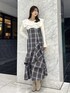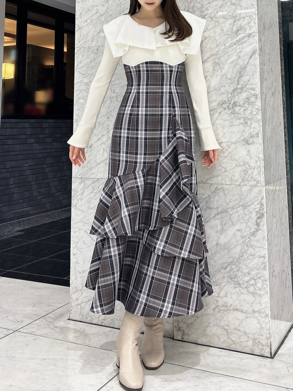 【ワンピース】 dazzlinで大人気のマイナス5キロ見えワンピース⟡.·*. バックリボンで簡単にウエスト調節ができ、ゆるすぎたりきつすぎることなく1番綺麗なシルエットを作り出してくれます。裾にかけてボリュームのあるデザインですが、広がりすぎないマーメイドシルエットのため、メリハリのある大人っぽい印象も残してくれます。カーディガンを羽織って襟だけ外に出してあげるコーデもおすすめです♡ 【シューズ】 シンプルとトレンドをこれ1足で楽しめるブーツ。膝下から足首にかけてのパーツはボタンで取り外しが可能で、ショートブーツとしてもお使いいただけます◎O脚気味の私でも脚をまっすぐに見せてくれました!足のサイズ24.0cmでMサイズがぴったりでした!