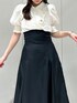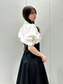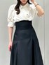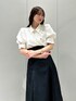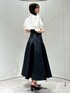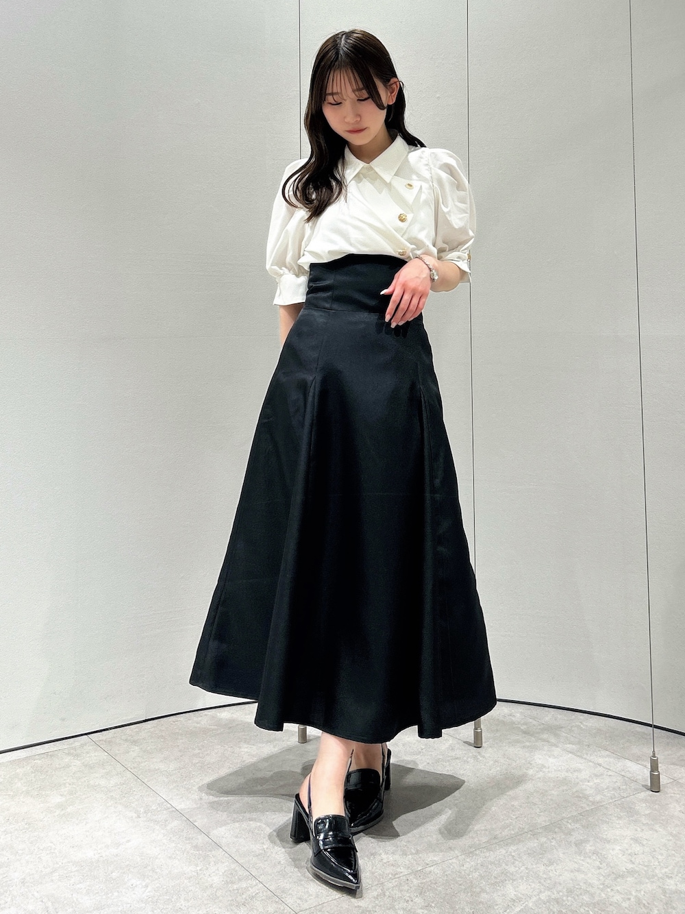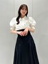 【トップス】 それぞれ異なるデザインボタンがポイントのブラウス。ボタンを留めると簡単にドレープを作り出せるため、着るだけでおしゃれ度がアップします⟡.·*.ボリュームのあるパフスリーブが女性らしく華奢な印象を与えてくれます。ボトムス問わず着回しがしやすいため、オンオフで使える万能ブラウスです。 【スカート】 ハリのある素材とマチ切り替えのボリューミーなシルエットで、体のラインを拾いにくいフレアスカート。バックのレースアップでウエスト調節が可能なため、1番綺麗なシルエットでご着用いただけます。サイズ展開が豊富で、154cm / Sサイズ着用で足首から拳一個分のため、低身長さんでも安心な丈感です。通年お使いいただけ、Tシャツ、ブラウス、ニットと幅広いアイテムと相性◎です♪ 【シューズ】 踵が開いたデザインで、ローファーでも重たくなりすぎないのが特徴です。ソックス合わせがおすすめです。 足のサイズ24.0cmでMサイズがぴったりでした!