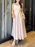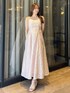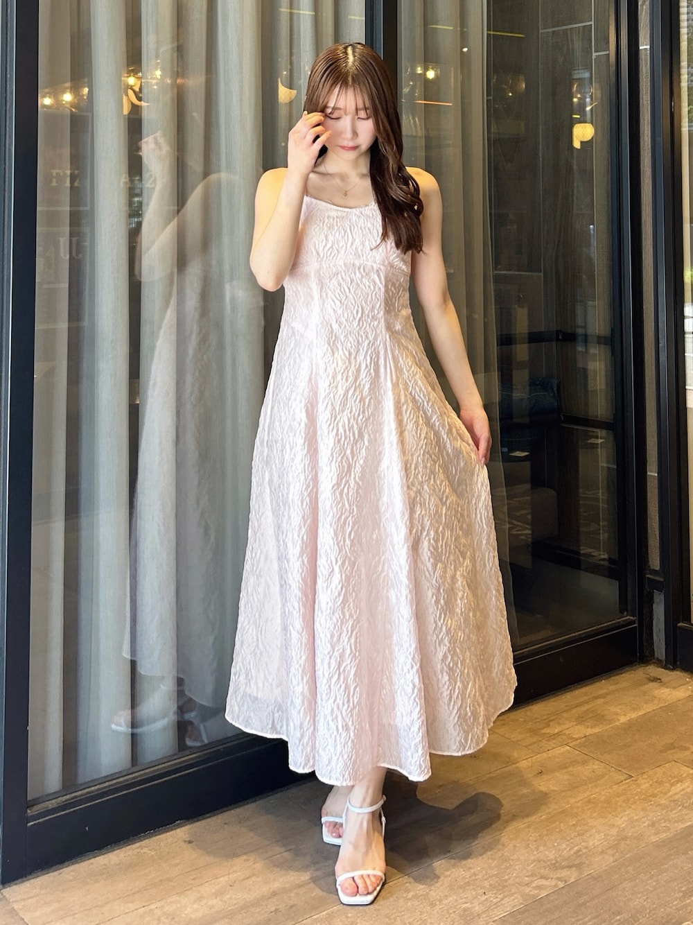 【ワンピース】 ふわっと軽いジャガードワンピース。ウエストはバックリボンで調節が可能なため、ジャガード素材のハリを活かして1番綺麗なシルエットでご着用いただけます。ウエストの切り替え位置が高めで脚長効果も◎丈は肩紐で調節可能です。Tシャツやノースリーブニット、羽織りを合わせて様々な着こなしをお楽しみいただけます。 【インナー】 カップ付きでバックは全面レースになっているため、背中開きのお洋服も綺麗に着られます。肩紐は細めでインナー感が出にくいのも嬉しいポイントです˖ ࣪⊹ 【シューズ】 シンプルなデザインで、カジュアルからフェミニンまで幅広く使える万能パンプス。華奢な細いストラップでカラーの面積が少ないため、カラーアイテムに挑戦したい方にもおすすめです。着用のオフホワイトのみラメが入っています。足のサイズ24.0cmでMサイズがピッタリでした。