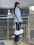 【トップス】 ペプラム部分がバルーンデザインのトレンドがギュッと詰まったトップス。ウエストはリボンで絞り具合を調節できるため、お好きなシルエットに変えていただけます。バックのアジャスターで袖のボリュームを調整できるのも嬉しいポイント。首元の紐はリボンにしたりくるくるっと巻くだけでも◎ 【ボトムス】 カジュアルすぎない美シルエットのフレアデニム。膝下から裾にかけて広がり美脚効果をもたらします。太ももにあるファスナーは開閉が可能で、開けるとスリットに早変わり。一気に抜け感を演出し、雰囲気を変えてくれます。154cm / Sサイズ着用で踵に少しかかる程度の長さで、フラットシューズでも問題なく着用できました。 【シューズ】 dazzlinで大人気のコルクヒールサンダルが復活!約12cmとヒールは高めですが、つま先側にも高さがあり安定感があります。軽量のため一日中歩いても疲れにくく、春夏のお出かけにおすすめです。私も店頭で愛用しています!足のサイズ24.0cmでMサイズがぴったりでした。 【バッグ】 ポケットが多数付いており機能性抜群のバッグ。夏らしい爽やかなカラーから秋まで使える大人っぽいカラーまで幅広いカラー展開でご用意しております。長めのハンドルで肩掛けもしやすいデザインです。お好みでチャームを付けても可愛いです。
