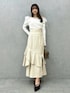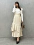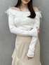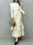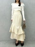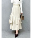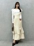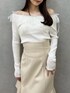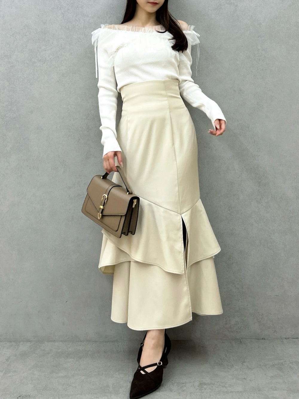 【トップス】 オフショルと2wayでご着用いただけるニット。チュールのフリルは程よいボリュームに落ち着いてくれるため、スッキリと華奢見えします。両サイドにあしらわれた細いリボンが、さりげなく可愛さをプラスしてくれます。 【スカート】 外に向かって上がる大ぶりなラッフルが視線を上へ誘導し、スタイルアップして見せてくれます。バックリボンでウエスト調整が可能なため、1人ひとりに合った美しいシルエットでご着用いただいたけます。フロントには膝あたりまで深くスリットが入っており、動きやすいデザインです。 【シューズ】 足のサイズ24.0cmでMサイズがぴったりでした!つま先のクロスデザインが足元を綺麗に見せてくれます。
