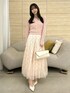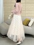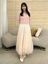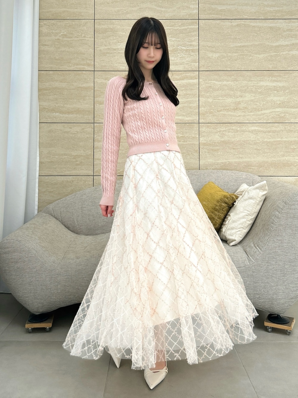 【トップス】 縦ラインの出るケーブル編みで、すっきりとした印象のニットトップス。 スクエアネックでデコルテを綺麗に見せてくれ、ボウタイブラウスなどを重ねてレイヤードコーデもお楽しみいただけます。 丈感はおへそより少し長めで、インでもアウトでもご着用いただけます。 【スカート】 昨年大人気だった高級感と華やかさのあるスカート。 スパンコールでチェック柄が作られており、光に当たるとパチパチキラキラと煌めく特別感のある1枚です。 チュール素材でとっても軽く、動くたびにふわっと揺れて躍動感を演出してくれます。154cm/Sサイズで足首に少しかかる丈感のため、低身長さんでも綺麗に着られます。