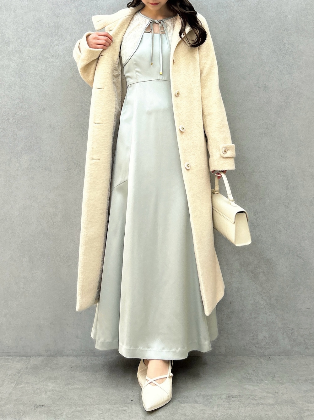 【アウター】 スタンドカラーでも着られるロングコート。程よいAラインに、ほっこりとしたあたたかみのある生地が女性らしさを演出。丈感短めのため、低身長さんも余裕を持ってご着用いただけます。ドットの裏地やデザインボタンと細部にまでこだわりの詰まった1着です。 【ワンピース】 藤井サチさんコラボの2ピースドレス。サテンのキャミワンピースは、落ち感のある程よくラインの出るシルエットで、バックのレースアップでウエスト調節が可能です◎レースのボレロが軽やかな女性らしさを演出し、華やかな印象にしてくれます。単品での着用ができるため、普段使いもしやすいアイテムです。 【シューズ】 足のサイズ24.0cmでMサイズがぴったりでした。つま先のクロスデザインが足元を綺麗に見せてくれます。