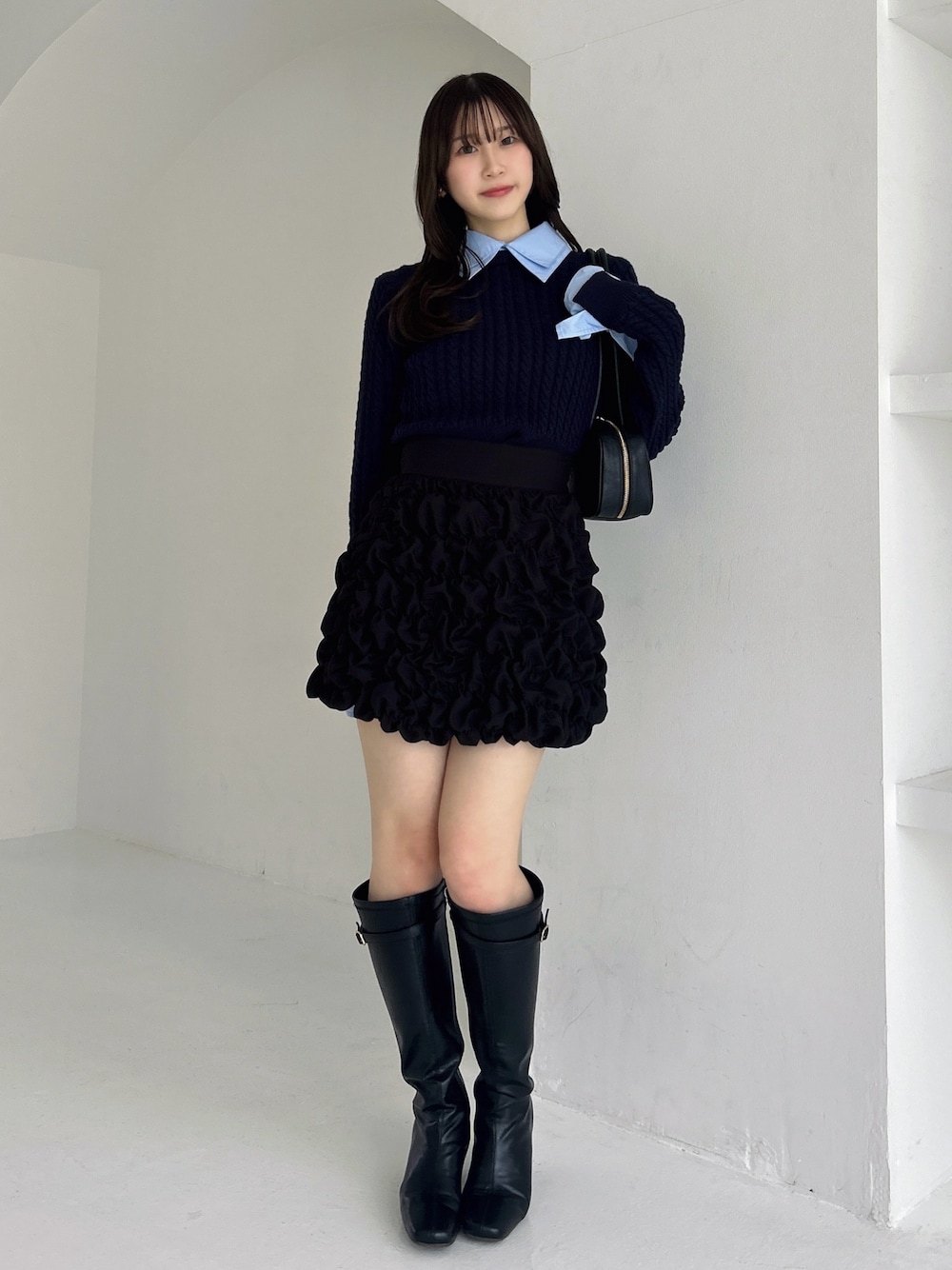 【トップス】 1枚でレイヤードスタイルが叶うケーブルニット。体に優しくフィットするコンパクトなサイズ感で、程よい厚みとケーブル編みが女性らしさを演出。袖丈長めで手元まで華やかに見せてくれます。襟は取り外しが可能なため、コーデの幅が広がります。 【スカート】 くしゅくしゅとした伸縮性のあるシュリンク加工が施されたミニスカート。シルエットはシンプルな台形のため、普段のボトムスに置き換えやすく、着回しの良さも抜群です。インナーパンツではないため、タイツなどのアレンジもしやすいです◎ 【シューズ】 シンプルで使いやすい王道ロングブーツ。やさしく馴染み、脚をまっすぐに見せてくれます。太めのヒールで安定感があり、スタイルアップが叶います。足のサイズ24.0cmでMサイズがぴったりでした。