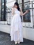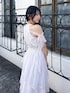 【ワンピース】 ふわ〜っと揺れる特別感たっぷりのシフォンワンピース。繊細なラメ混の生地を使用しており、夏の日差しにキラッと煌めきます。コルセット調のデザインがウエストをしっかりマークし、自然なスタイルアップを叶えます。肩のリボンは取り外し可能です◎