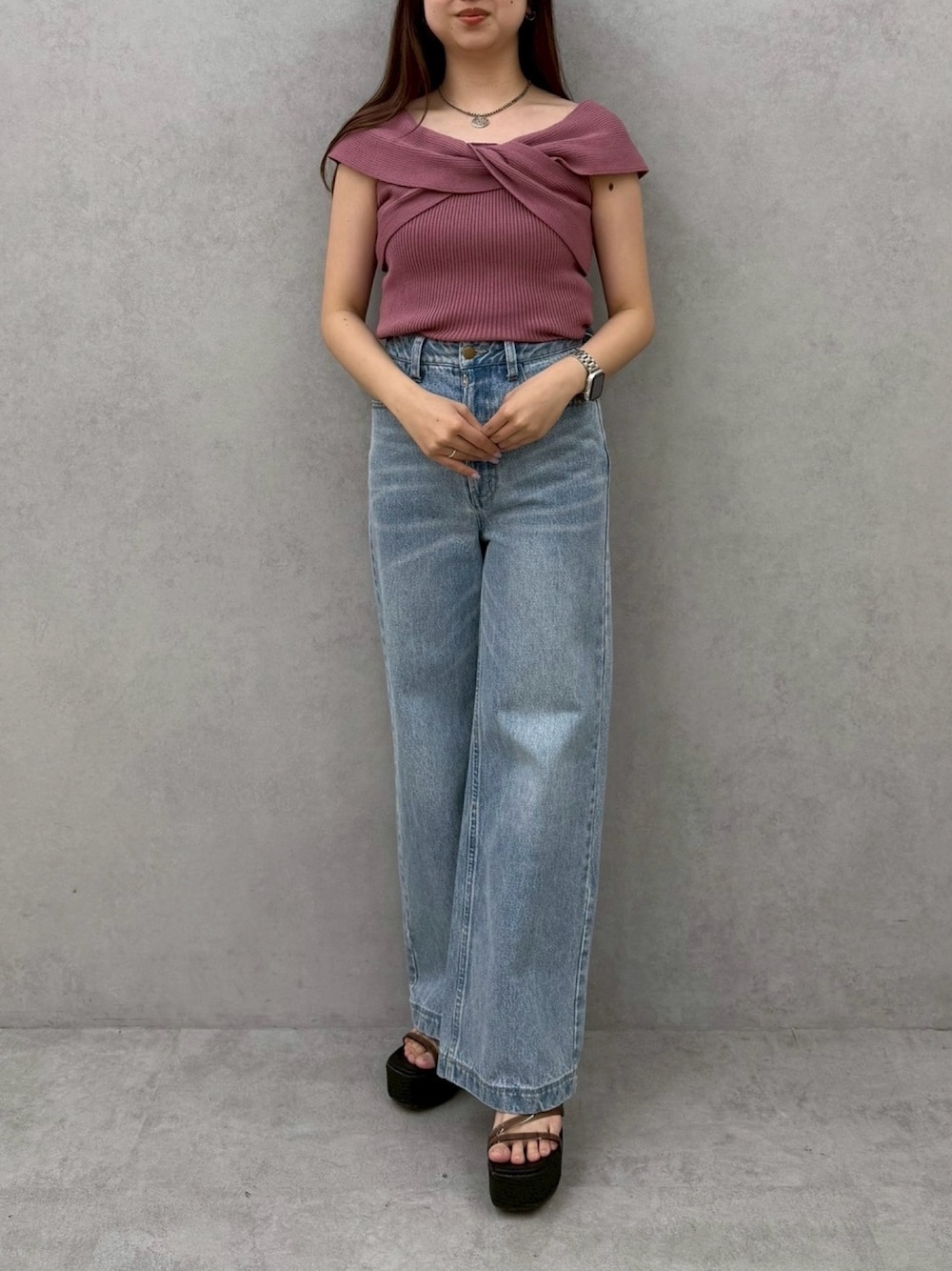 【トップス】 二の腕カバーができるのが嬉しいオフショルトップスです♪ ニット生地なので伸縮性がありとても着心地が良かったです。 【デニム】 ライトブルーのSサイズ着用です。 153cmで丈感、ウエスト丁度良いサイズ感でした!