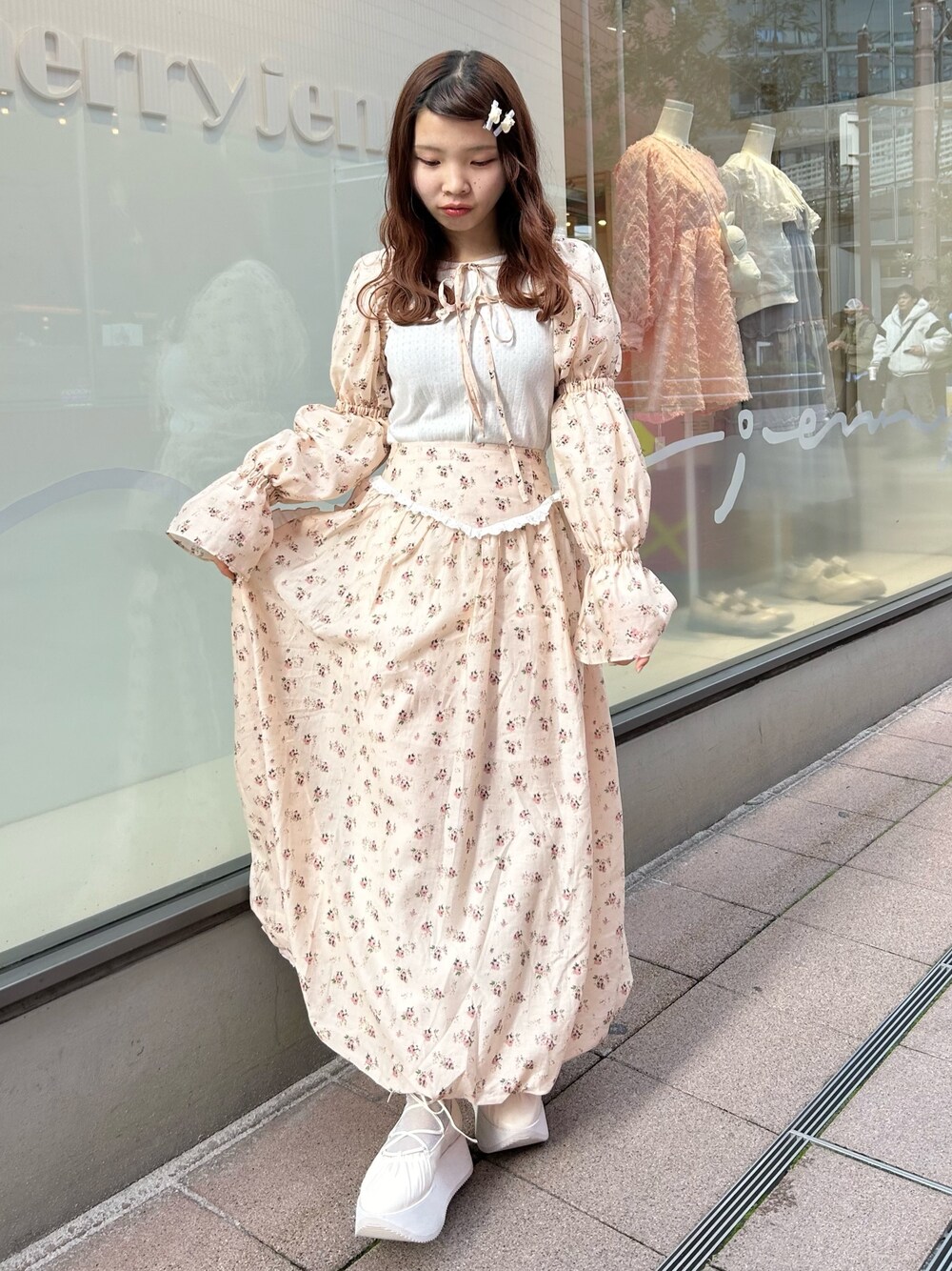 特別な日にもお使いいただけるセット🫶🏻 コーラルピンクにお花柄が散りばめられた、スリーブとバルーンスカート🎀 スリーブは前と後ろどちらでも着用いただけますが、ガーリーな着こなしがお好きな方にはリボンを前にするのがおすすめ🫶🏻ゴムがしっかりしてるので1日着用していて肩からずり落ちてくることもなかったです! スカートはトレンドのバルーンスカート🎈ウエスト周りがきゅっとなってますが、後ろがゴムなのでラクチン◎152cmでもひきずらない丈感です🌟 インナーは肌触りもよく体にフィットしてくれます!袖口にギャザーがついていて1枚できてもかわいい🥨何にでも合わせることができるので1枚持っていて損はないです☁️ Maison terrierコラボのヘアピン🐶ちょこんと乗ったわんちゃんがかわいい🫶🏻耳かけして止めたり、ハーフツインしたゴム部分につけたりなどアレンジの幅が広がります₍ᐢɞ̴̶̷ ·̮ ɞ̴̶̷ᐢ₎ シューズはトレンドの船底になったもの🚢華奢〜〜なリボンでレースアップできるので足首もすっきり見せることができます!22.5cmでMサイズ着用しております!