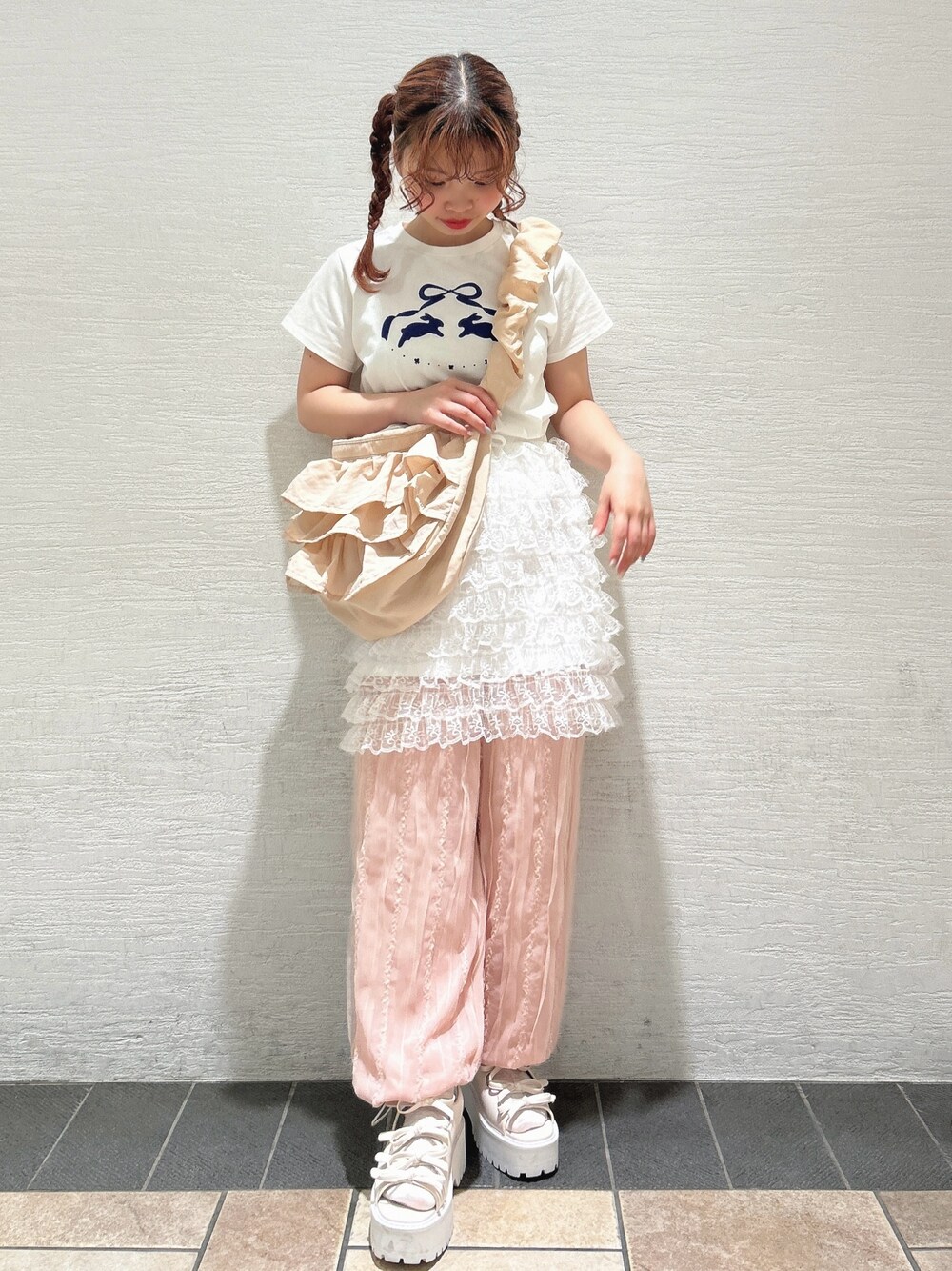 Tシャツはジャストサイズで身体のラインを拾いやすい形ではありますがお袖にはゆとりがあるので腕はすっきり見せてくれます🐰 スカートはボリュームたっぷりでパンツ合わせもかわいいデザインです🫶🏻ウエストはりぼんでしぼれるデザイン🎀152cmでふとももまんなかくらいの丈感です! パンツは裾をしぼれるようになってるので低身長さんにも安心🫶🏻肌触りもよくラクチン〜〜なパンツです☁️ サンダルはスクエア、厚底とたくさんのりぼんのバランスがかわいい厚底サンダルで、22.5cmでMサイズ着用してます🪽 ショルダーバッグは見た目よりも大容量でマチもしっかりあるので私は出勤バッグに使っています🫶🏻ショルダーもくしゅくしゅになっていてアクセサリー感覚でお使いいただけます🐏