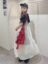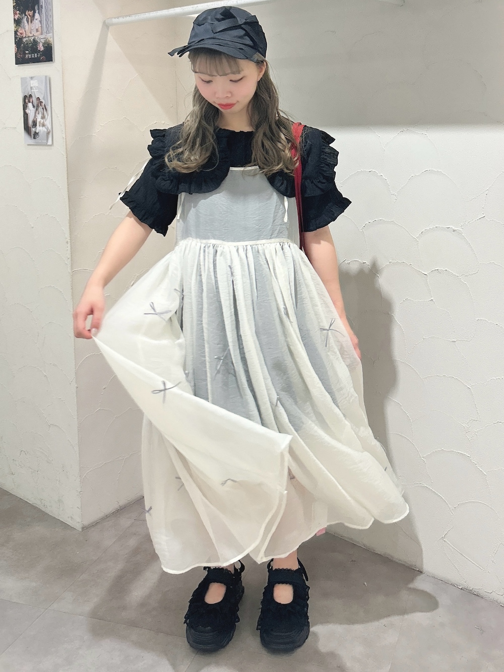 上に重ねているワンピースはシアー素材でりぼんがたくさんついたレイヤードワンピ。肩紐で長さの調節も可能です♡ 中に着ているワンピースはくしゅくしゅっとした生地感なのてシワになる心配がなく、お手入れラクチンです♡ バッグはぱきっとした赤色が目を引くレースバッグ。ペットボトルも縦に入る大容量サイズです♡ キャップはりぼんがぐるっと繋がったようなデザイン。サイズ調節も可能です◎ シューズは夏は裸足でサンダルとしても着用できる、サンダルスニーカー。22.5cmでMサイズ着用です!