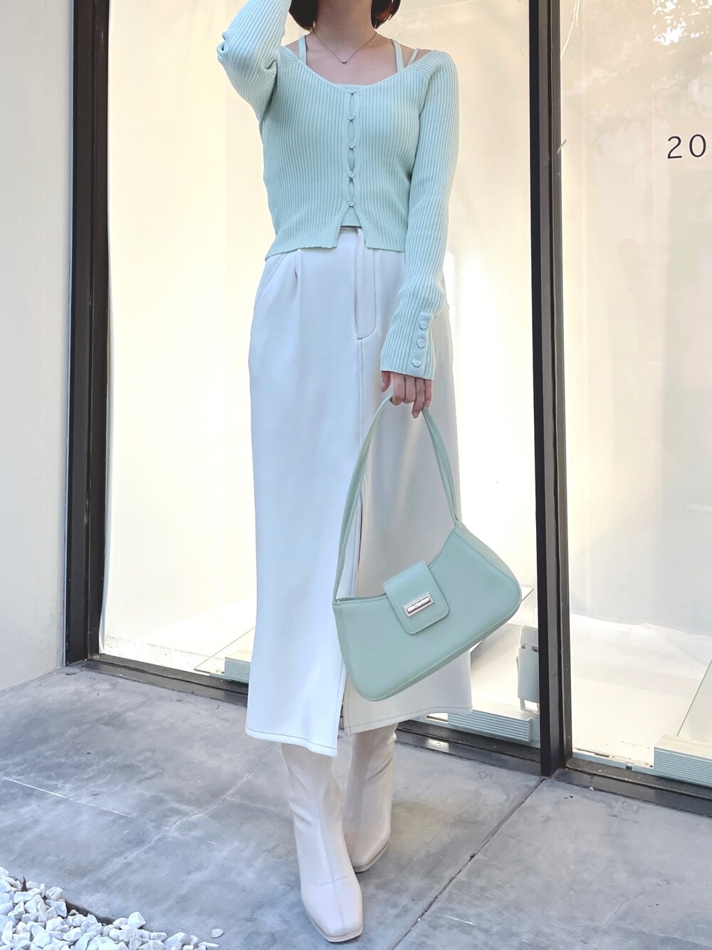 【トップス】ショート丈なのでインしなくてもスッキリ着れます!バッククロスなので後ろ姿もとっても可愛いです🤍 【スカート】深めのスリットでさりげなく肌見せできます🤍ラインが出過ぎないので下半身気になる骨格ウェーブの方にもオススメです🥰