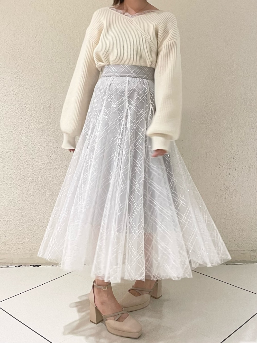 【トップス】 チラッと肩が見えるオフショルがとても可愛いです🤍丈が短めなのでインしなくてもスッキリ着れます🕊 【スカート】 大人気すぎるスパンコールスカート✨動くたびキラキラするのが可愛くて、シルエットもめちゃめちゃキレイです🤍