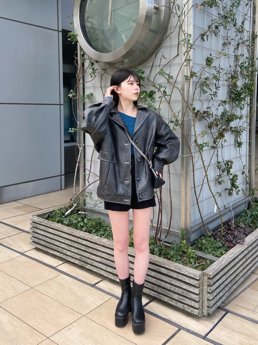 【outer】大人気のレザージャケットです!161cmでお尻半分くらいが隠れる丈感で、裾のゴムで丸みのあるシルエットでスッキリ見せしてくれます◎お袖が広めなので分厚いトップスの上からでも羽織れるので、ロングシーズン使って頂けます◎【tops】シンプルで使いやすいタイトニットです!アシンメトリーなデザインで程よい肌見せが可愛いです❤︎ジャンパースカートなどのインナーとして使っても◎ 【pants】ほとんどのスタッフが愛用しているニットパンツ❤︎ハイウエストなので美脚効果抜群で、オーバーニットなどと合わせて裾をチラッと見せても可愛いです◎