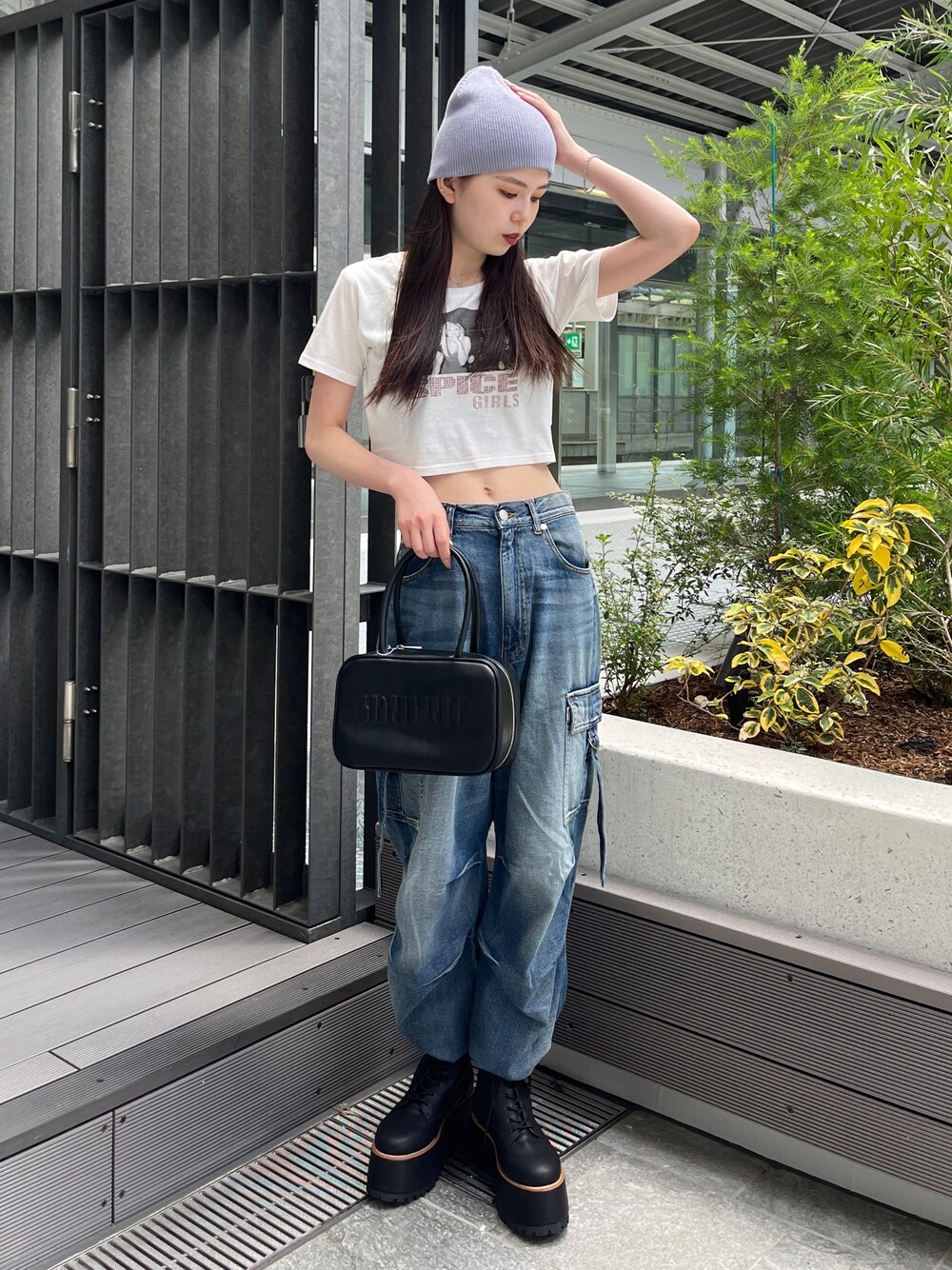 【tops】SPICE GIRLSコラボのショートTシャツです!トレンドのy2kファッションにぴったりのTシャツ❤︎コンパクトなシルエットで華奢見えしてくれます◎ 【pants】スタッフ皆大注目のカーゴデニムです!デニムなのにとっても軽くて、薄手の生地感なので夏でも涼しく履いていただけます◎裾にボタンが着いており、絞って中に折り込むとボリューム感のあるシルエットになり、丈感問題解消、ブーツイン風にも履いていただけます❤︎ 【shoes】店頭でも実際履いているレースアップブーツです!傾斜がないので8時間立ち仕事でも全然疲れないです◎見た目以上に軽くて、ソールにボリューム感があるのでコーデのバランスも取りやすいです◎ 【bag】オシャレ見え抜群のレザーボストンバッグです!マチもしっかりしていて、少し荷物の多い私でも使いやすい大きさです(^^)