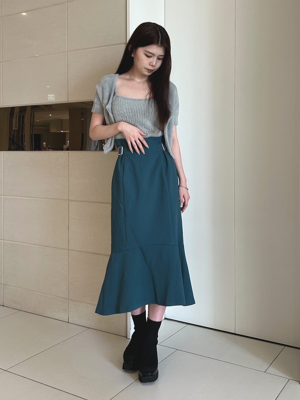 【tops】キャミソールとジップカーディガンがセットになっており、着回し抜群です◎程よい毛並みのシャギーなので、着膨れせずスッキリ見せてくれます!もちふわな素材感でずっと着ていたくなります❤︎ 【skirt】美シルエットマーメイドスカートです!サイドのベルトで締めつけ調節ができるので、小柄な方もぴったりで履いて頂けます◎後ろにスリットが入っており、足モノに抜け感が出て可愛いです! 【shoes】大人気のソックスブーツです!見た目以上にとっても軽くて、スニーカー感覚で履いていただけます◎傾斜もほぼなく、長時間歩いていても疲れずらいです! 普段23~23.5を履いており、23.5でぴったりでした◎