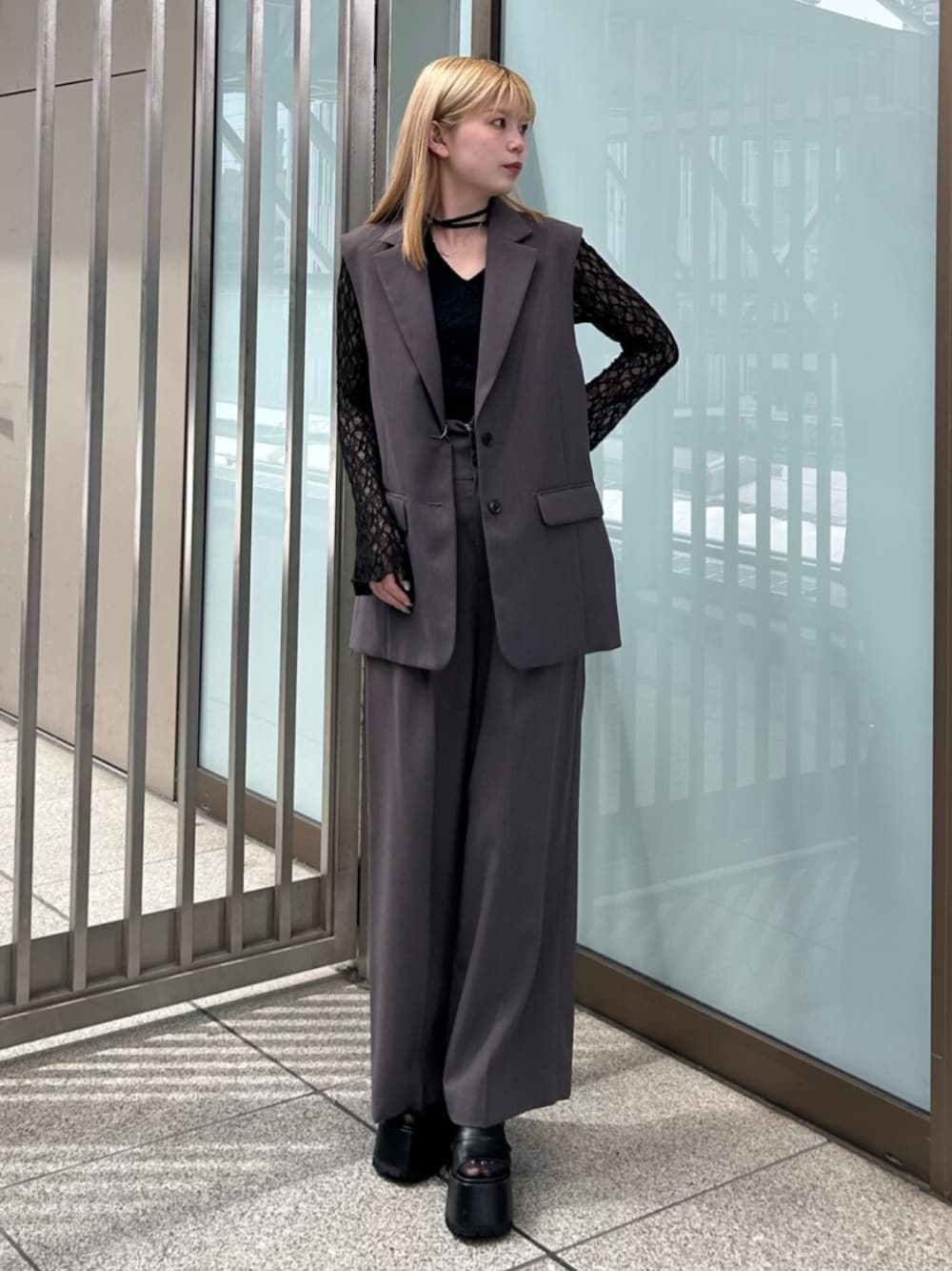 【jacket】毎年大人気のジレです!さらっとした素材で高級感があり、両サイドのZIPを開けるとチュールが出てくるのがポイントです❤︎ 【pants】ジレとセットアップ着用可能のパンツです!ハイウエストで美脚効果抜群です❤︎背中がゴムなのでとても楽ちんです! 【tops】1枚は持っておきたいレーストップスです!首元の紐はクロスにしたり、後ろでリボンにしたりお好みで雰囲気を変えられます❤︎腕以外は裏地がドッキングされているので、インナーを考えず1枚で着用可能です! 【shoes】店頭でも実際履いている厚底サンダルです!見た目以上にとても軽く、傾斜があまり無いので安定感抜群です!8時間立ち仕事でも私は全然疲れません❤︎普段23.5を履いており、こちらも23.5でぴったりです!