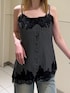 【tops】レースデザインが可愛いキャミソールです!裾がアシンメトリーになっているのもポイントで、着るだけでおしゃれ感アップします!半袖や長袖の上からビスチェとして着用してもとても可愛いです! 【pants】スタッフ人気も高いダメージデニムです!ゆるっとしたシルエットですが、腰周りがスッキリ見えます♥とても楽ちんで、デニムでありながら柔らかくとても履きやすいです! 【shoes】店頭でも実際履いている厚底サンダルです!見た目以上にとても軽く、傾斜があまり無いので安定感抜群です!8時間立ち仕事でも私は全然疲れません♥普段23.5を履いており、こちらも23.5でぴったりです!