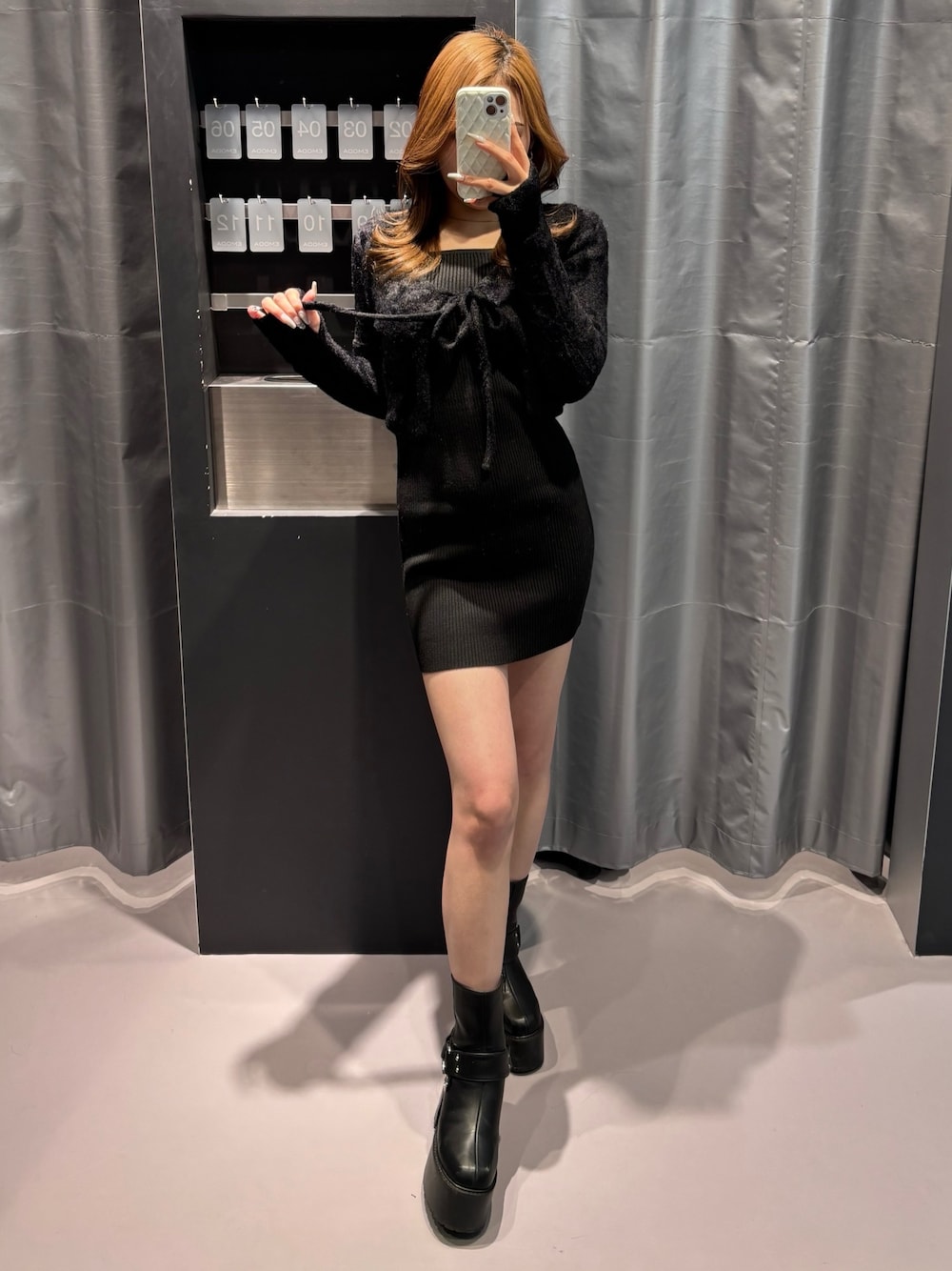 ワンピースはシャギーのカーディガンがセットになった大人可愛いセットワンピです❤︎ 中はノースリーブのワンピースなので、別々で夏でも着れますし、羽織を変えて春も着れます!カーディガンは別のインナーに合わせても可愛いので着回し抜群アイテムです💕 タイトなシルエットですが生地は肉厚なので体のラインを拾いすぎないのもポイントです! シューズは大人気の厚底ショートブーツ✨ チャームは取り外しが出来るのでコーデに合わせて履けます❤️ 普段24.5cm着用でLサイズでピッタリでした!
