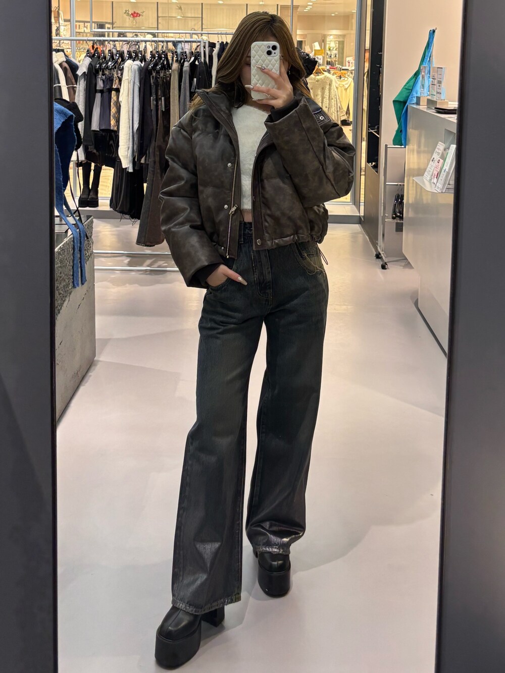 インナーのトップスは毎年大人気のスキンラインの形で、今期はシャギーの生地になっています♡フワフワで伸びが良く首周りもスッキリ見えて1枚持っておくと春にも使える万能アイテム♡ アウターはフェイクレザーのダウンでつや消しのマット素材なので高見え抜群‼️ 一般的なダウンに比べるとボリューム感があり過ぎない為スッキリとしたシルエットで着用出来ます! 素材はダウン50%フェザー50%なので防寒性にも優れています✨ デニムは裾に向かってキラキラとしたメタルのウォッシュが入っておりオシャレに着こなせます🩵ハイウエストでストレートワイドなので脚長効果抜群です!普段XSやSサイズの私はSサイズでピッタリでした! シューズは大人気の厚底ブーツで高さがあるのに傾斜感が少ないので平に近いような感覚で歩ける優秀ブーツ!私は普段24.5cmでLサイズでピッタリでした!