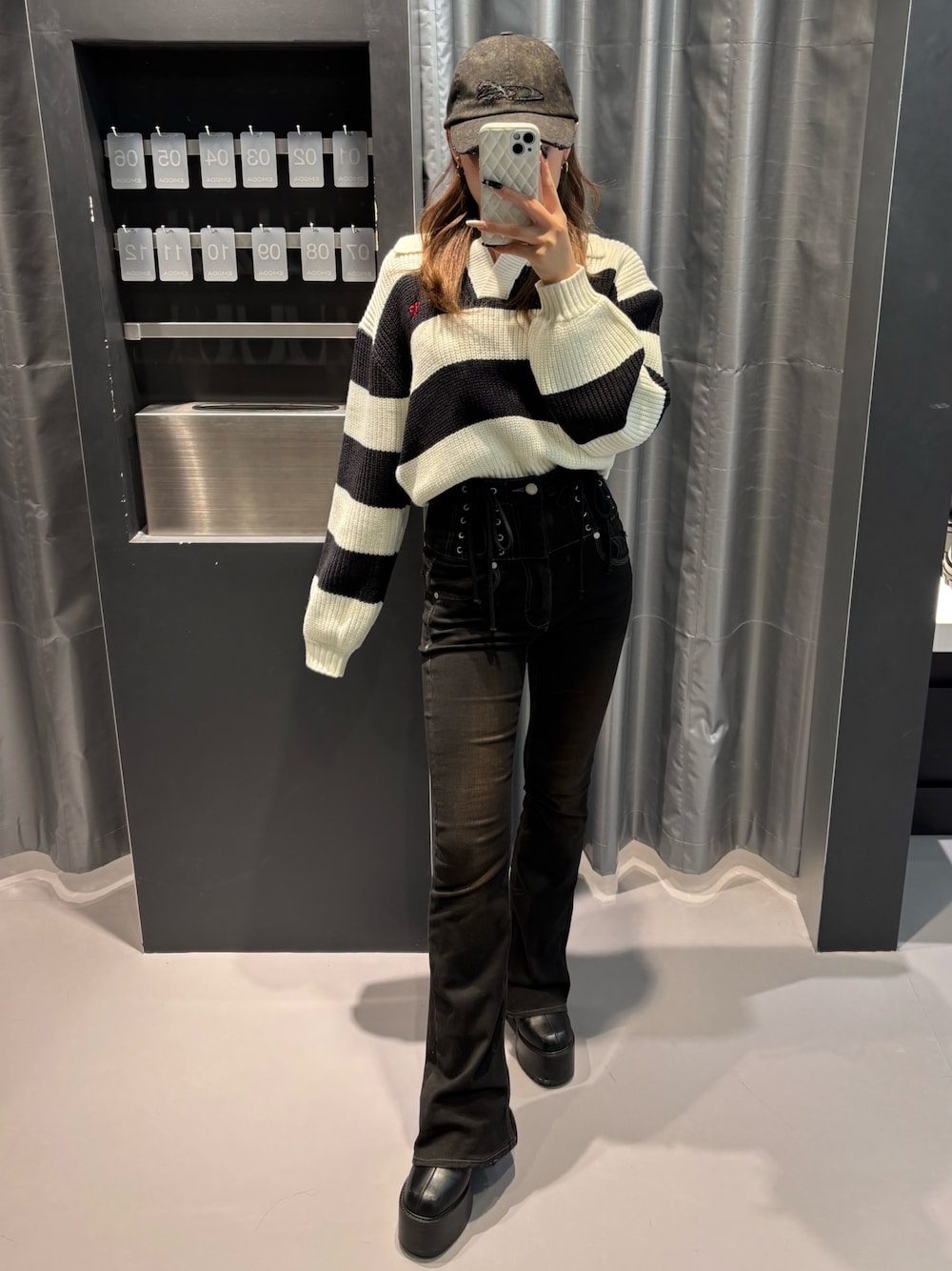 キャップは新作のビンテージ加工が入ったキャップです❤️ロゴも入っていて、これ1個で今っぽいコーデになります! トップスは襟が着いていて首元がスッキリ空いたゆるっとシルエット✨ 春1枚で着てスカート合わせも可愛いです! ボトムスはEMODAで大人気のフレアデニム! ハイライトにブラウンのウォッシュが入っていてオシャレ盛れします! ウエストがレースアップになったハイウエストのデニムで伸縮性が良く、着心地も抜群です! 普段XS着用で、XSでピッタリでした! シューズは、チャームが取り外し出来るタイプで、高さがあるのに傾斜感が少なく平に近いような感覚で履けるストレスフリーのブーツです 普段24.5cmでLサイズでピッタリでした!