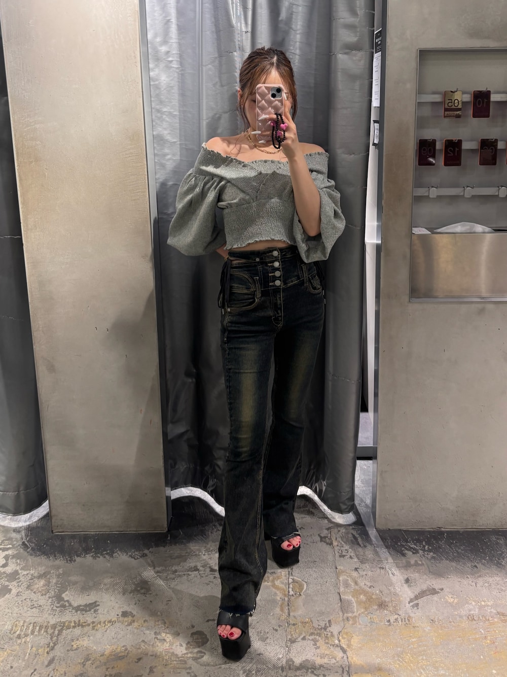 〚トップス〛 オフショルでも肩をしまっても着れる2wayの形です!二の腕を隠してくれるので着やすさと細見え抜群アイテム💕 〚デニム〛 ハイウエストのフレアデニムで物凄くストレッチが効くのでワンサイズ下げての着用がおすすめ✨足長効果抜群アイテムです! 身長157cmでXSでピッタリです! 〚サンダル〛 EMODAで有名の14cmヒール! 高さがあるのに傾斜感が少ないのでストレスフリーに履けます! 普段24.5cmでLサイズでピッタリでした!