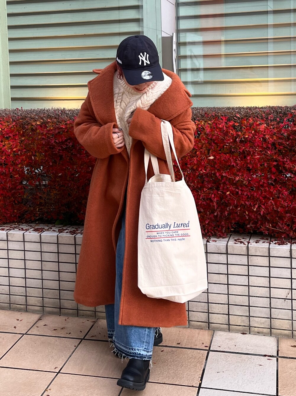 後藤茉耶(Ungrid)のチェスターコート「スライバーチェスターロングコート」を使ったコーディネート