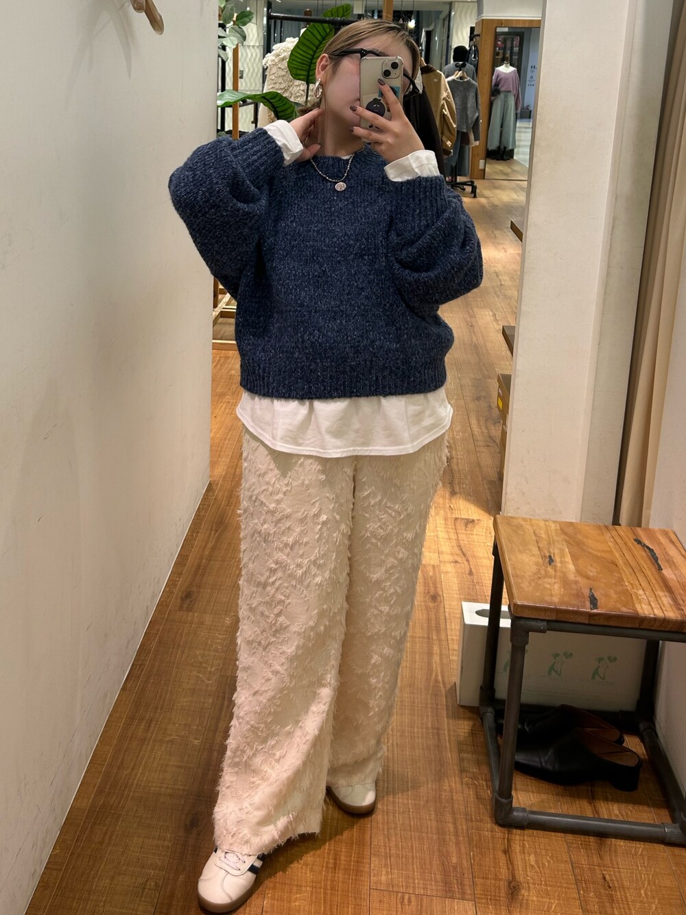 トップスはモヘアニットのブルーを着用しております◎! 去年よりも着丈が短くなっているので インしなくてもおしゃれに着こなせる丈感です♡ ラウンドロンT等をレイヤードしても 可愛いです◎ パンツはジャガードラフパンツのアイボリーを着用しております! フリーサイズで154cmですが 靴に乗っかってくれる丈感なので スニーカーやブーツに合わせても可愛いです! パンツに柄が入っているので 全体の雰囲気をオシャレにしてくれるアイテムです