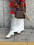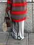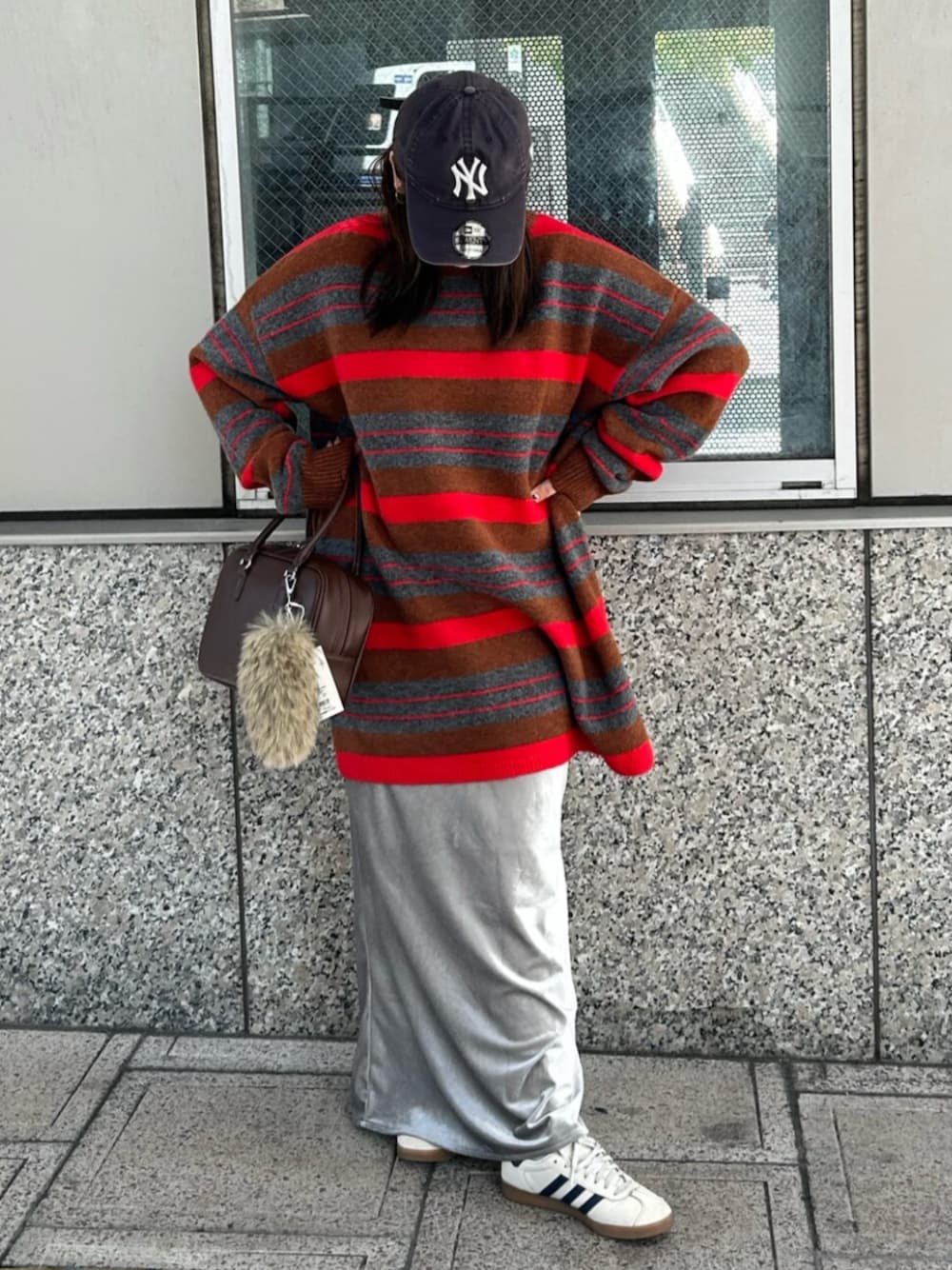 トップスはマルチボーダールーズニットの レッドを着用しております! すっぽり着れるサイズ感で 154㎝だと膝上くらいの丈感でした! もちもちの肌触りなので 着心地も抜群です! スカートはフィットベロアスカートの Sサイズを着用しております! 丈を長めに履きたかったので少し腰履きしております!◎ ウエストラインで履いて フラットのスニーカーで合わせても 引きずらない程度の丈感です! バックはフェイクレザースクエアハンドバッグの ブラウンを持っております! コンパクトで大容量のハンドバッグです!