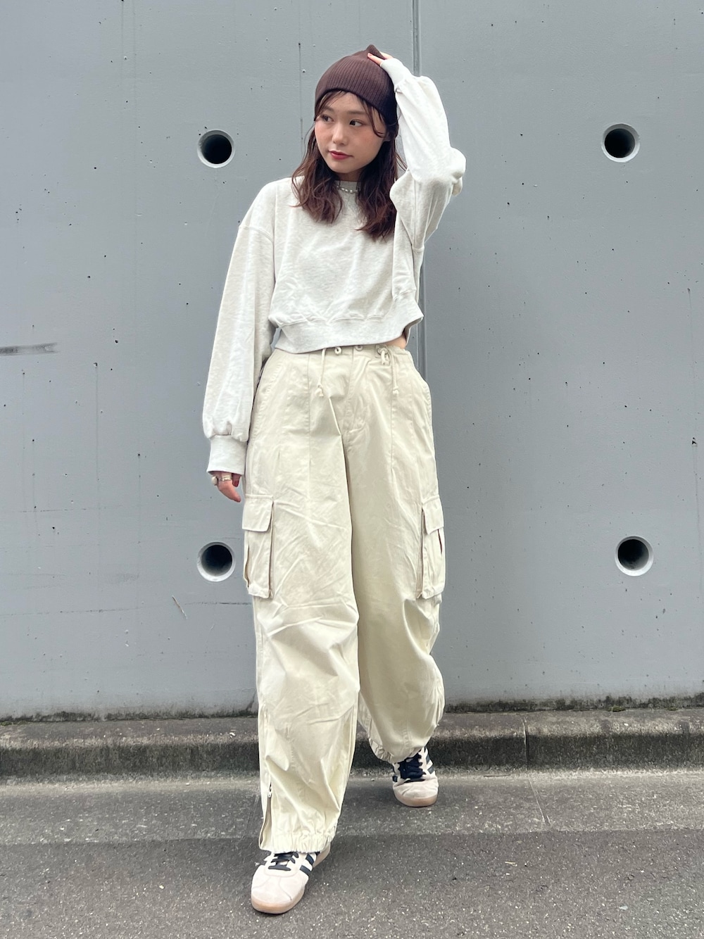 【帽子】 ungrid 定番商品のニット帽♡ カジュアルなカーゴパンツやデニムスタイリングからレディなブラウスやワンピーススタイリングまで幅広くお召頂けます! 【トップス】 ウエストが隠れる程のショート丈です! ボリュームあるスリーブが可愛いですよ♡ 【ボトムス】 160cm、sサイズでくるぶししっかり隠れる程の丈感です! 裾の部分にはジップデザインで、裾のシルエットを調節することが出来ます。